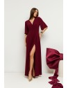 Błyszcząca sukienka maxi z kopertowym dekoltem - bordowa