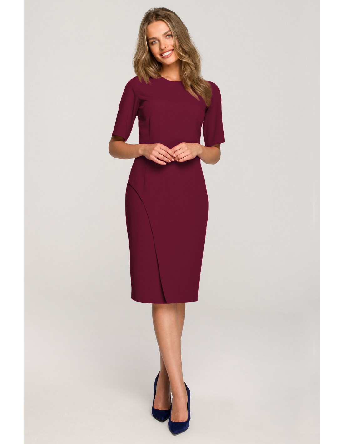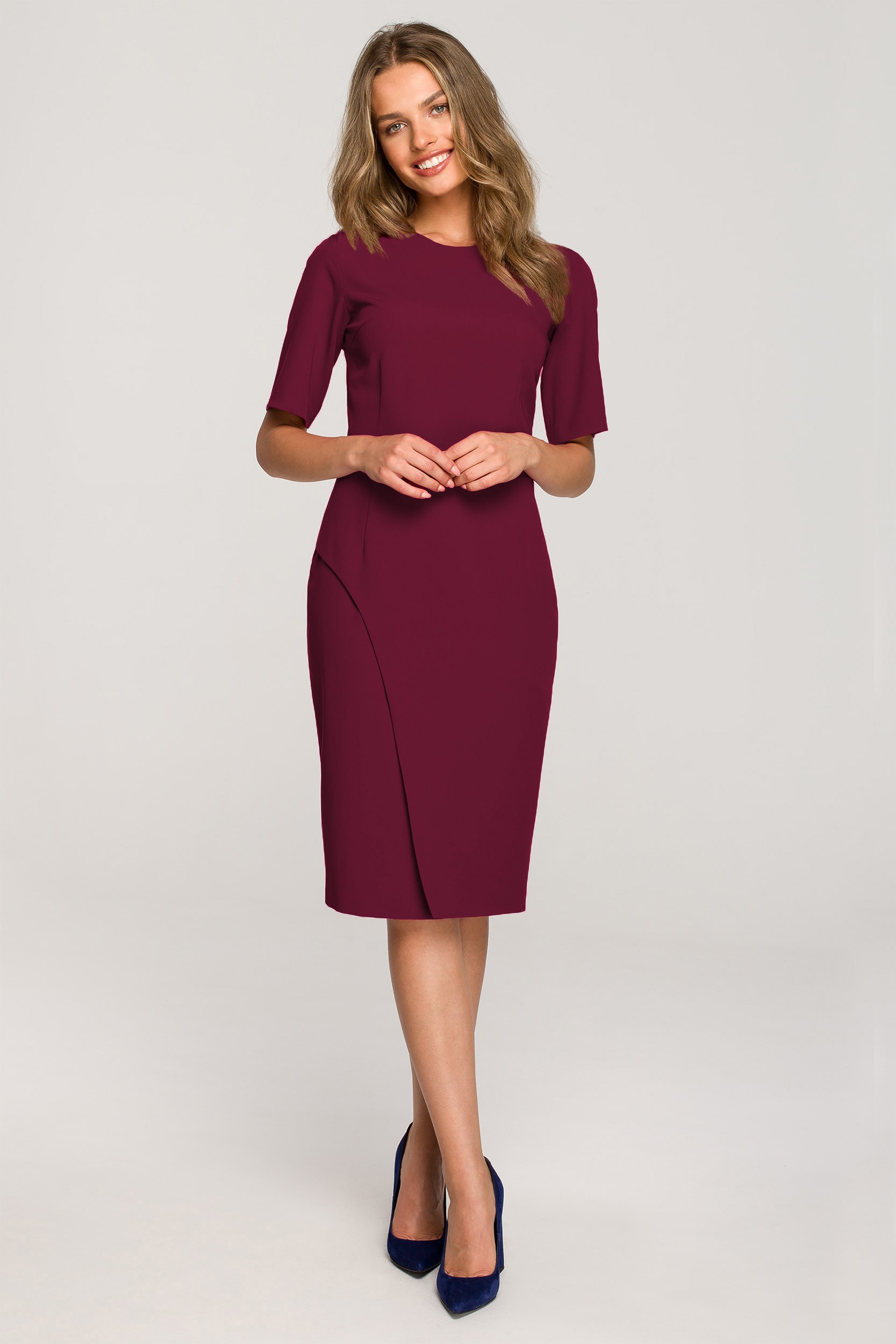 Bordowa midi sukienka z krótkim rękawem przyda Ci się przy wielu okazjach! Możesz sięgnąć po nią na przykład szykując się na rodzinną uroczystość, ubrać do pracy lub na wyjście ze znajomymi. Sukienka midi o prostym kroju, elegancko podkreślającym sylwetkę. Posiada niewielki, okrągły dekolt oraz dyskretne zapięcie na suwak na tyle. Finezyjnie wycięta zakładka na przodzie stanowi ciekawy efekt wizualny, będąc jedyną ozdobą prostego fasonu sukienki. Zakładając do niej buty na obcasie oraz klasyczne dodatki zapewnisz sobie stylizację wpisującą się w nienaganną elegancję! Sukienka wyprodukowana w Polsce.