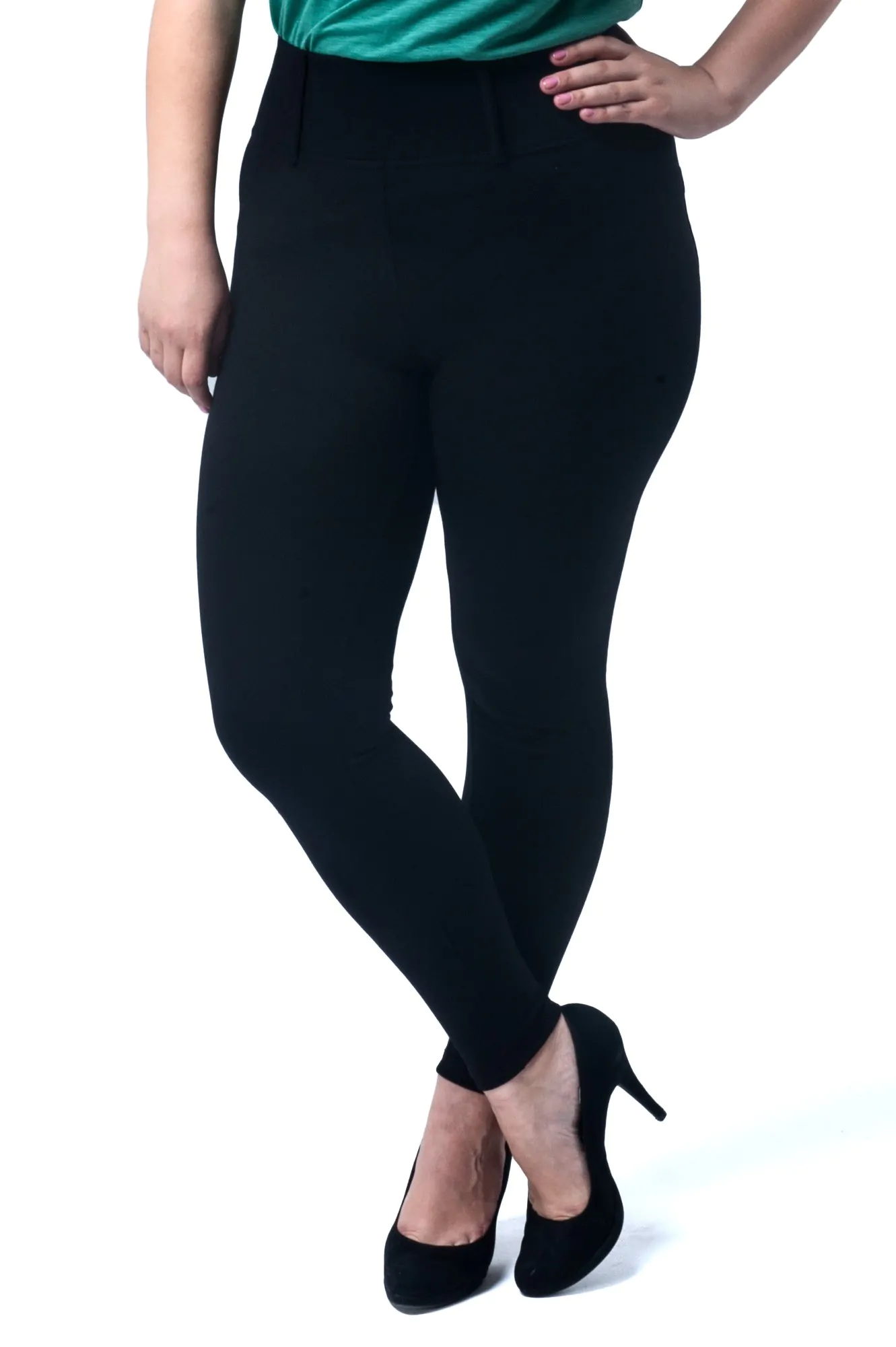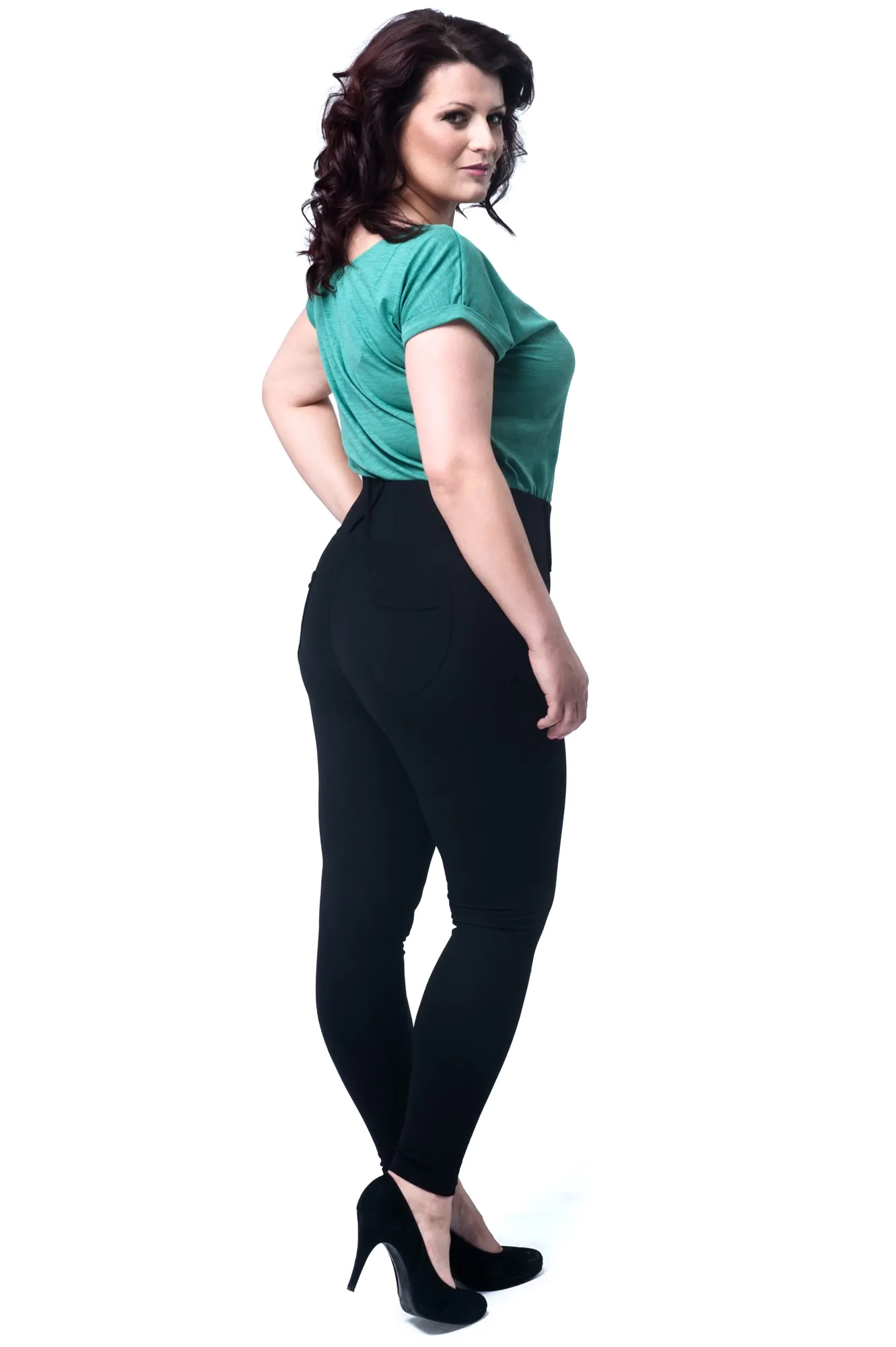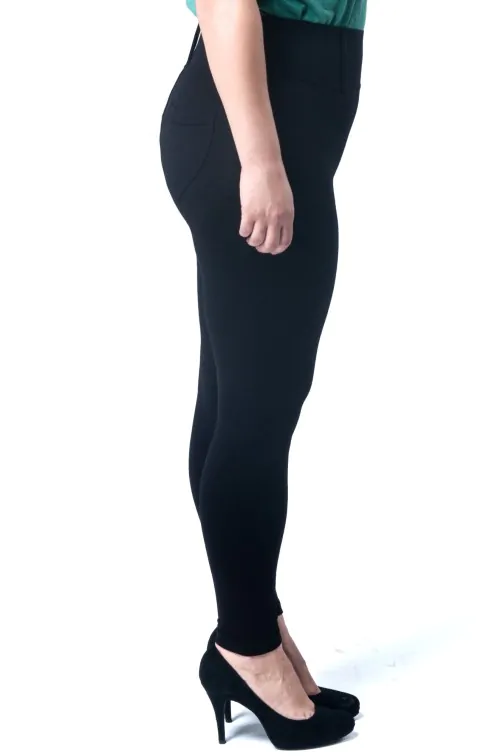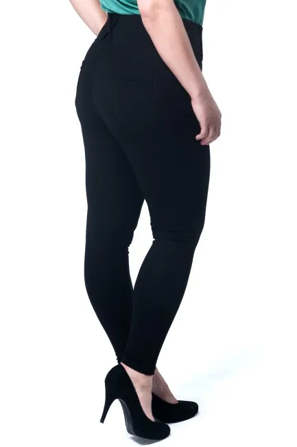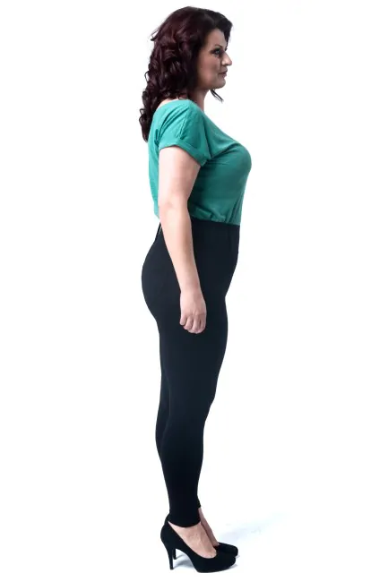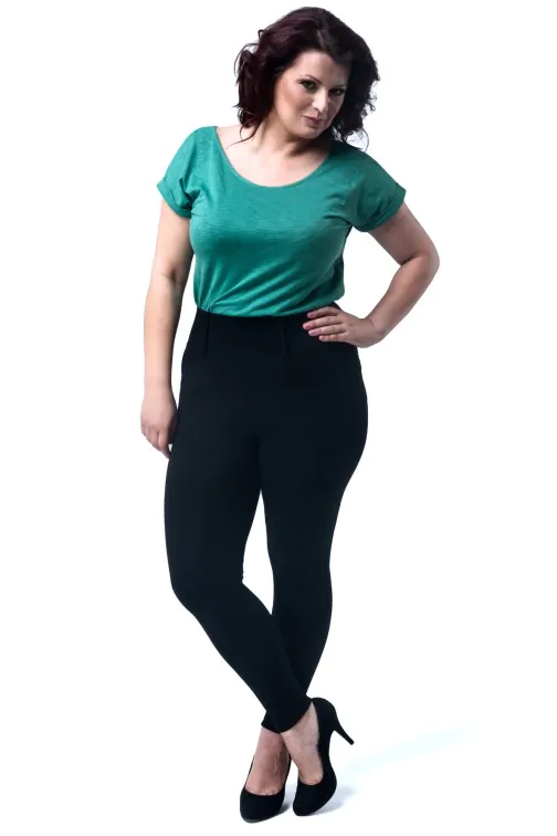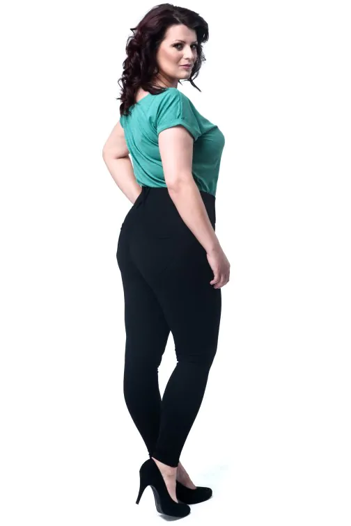 Dopasowane, wyszczuplające legginsy damskie dla kobiet w rozmiarze XXL. Kobiece legginsy ze szlufkami i kieszeniami z tyłu. Nowoczesny fason i model, który został wyprodukowany przez firmę Paulo Connerti.