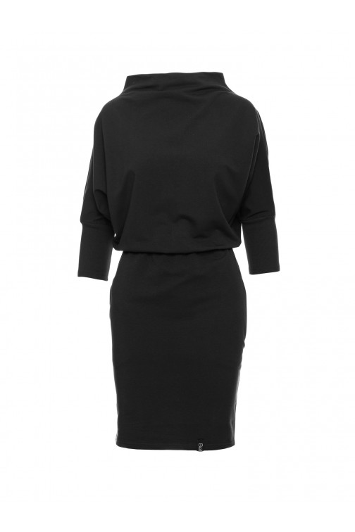 Połączenie kroju kimono z dzianiną bawełnianą to maksimum wygody i komfortu, jaką możesz osiągnąć! Luźna góra doskonale komponuje się z ołówkowym dołem zapewniając idealne proporcje sylwetki. Rękawy o kroju kimono zostały zakończone wąskimi ściągaczami, a przy dekolcie znajduje się wysoki, luźno opadający kołnierz. Część spódnicowa jest dopasowana i ma kieszenie w szwach bocznych, oddzielona jest od góry gumką umieszczoną w talii. Czarna stylowa sukienka mini z rękawami kimono odkrywa nogi i pozwala wyeksponować ulubione buty - w tym przypadku klapki na obcasie bądź płaskiej podeszwie, trampki czy sandałki będą trafnym wyborem. Sukienka wyprodukowana w Polsce.