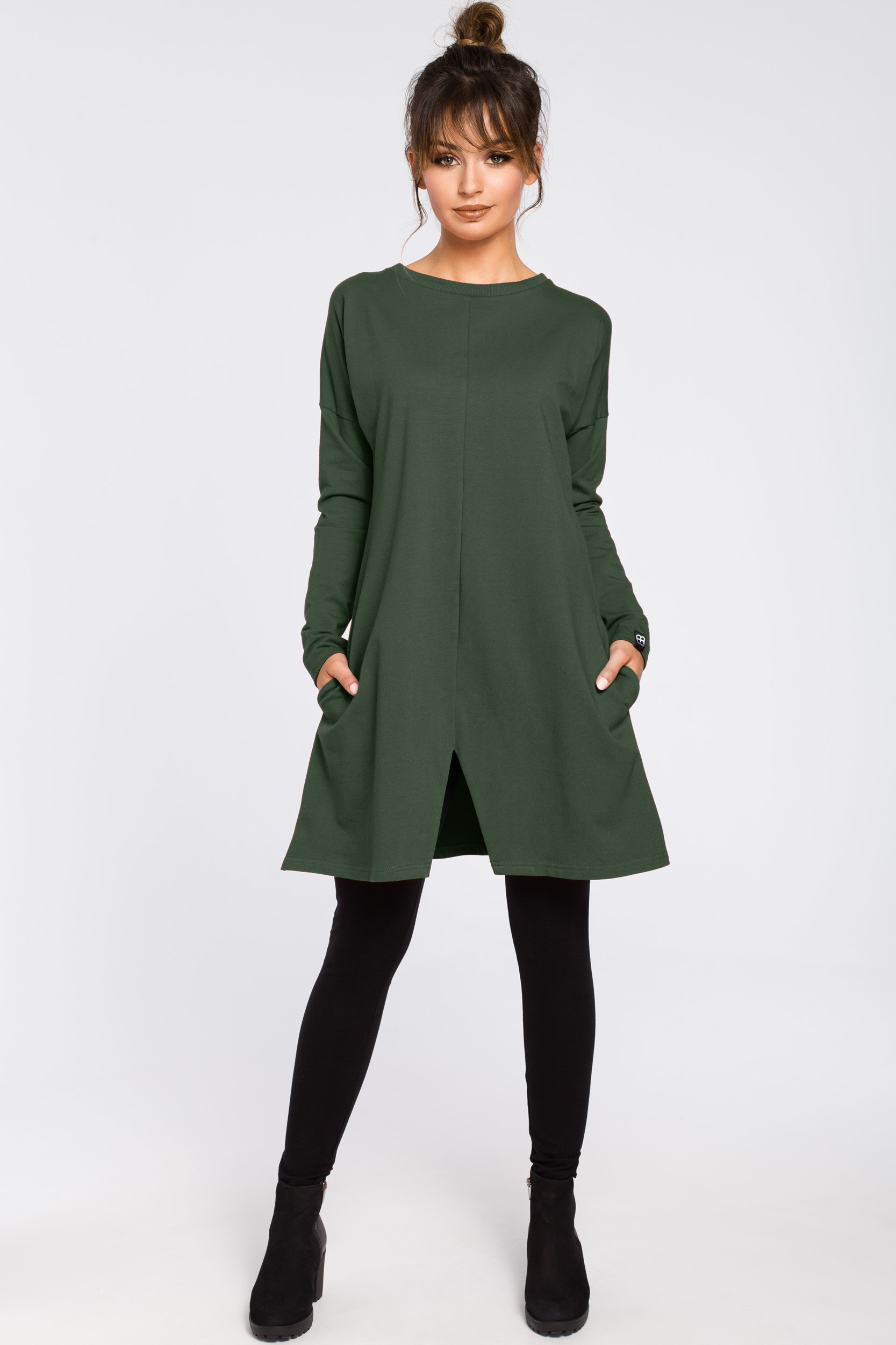 Uwielbiasz tuniki i marzy Ci się nowa, która nie będzie kopią poprzedniej? Ten model z pewnością Cię zaskoczy swoim niebanalnym krojem! Tunika o trapezowym kroju wycięciem u dołu i kieszeniami po bokach. Taki fason pasuje na każdą sylwetkę, bez względu na rodzaj figury. Uszyta jest z miękkiej dzianiny dresowej, więc komfort podczas noszenia masz gwarantowany! Zielona tunika z wycięciem z dołu będzie idealna na spacer, po domu, do szkoły, a także do pracy, w której nie wymagany jest “dress code”. Z czym ją nosić? Legginsy lub jeansy slim będą trafnym wyborem. Do tego dorzuć sneakersy, a chłodniejsza porą botki czy kozaki i ramoneskę lub płaszcz typu trencz. Stylizacja gotowa! Wyprodukowaliśmy ją w Polsce.