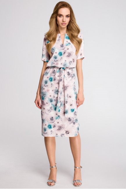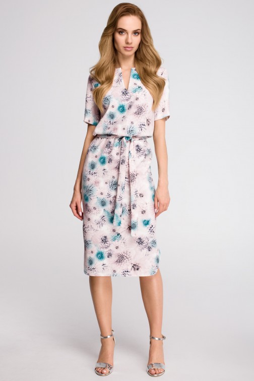 Przyciągający oko pastelowy nadruk to główny atut tej sukienki. Luźno opadająca góra z pękniętym dekoltem, wiązany pasek i lekko dopasowana spódnica zakończona na półokrągło dodają tej sukience dziewczęcego wyglądu. Wyprodukowano w Polsce dla Cudmoda.