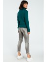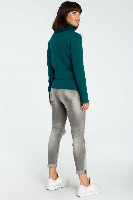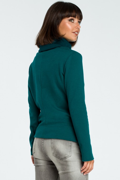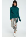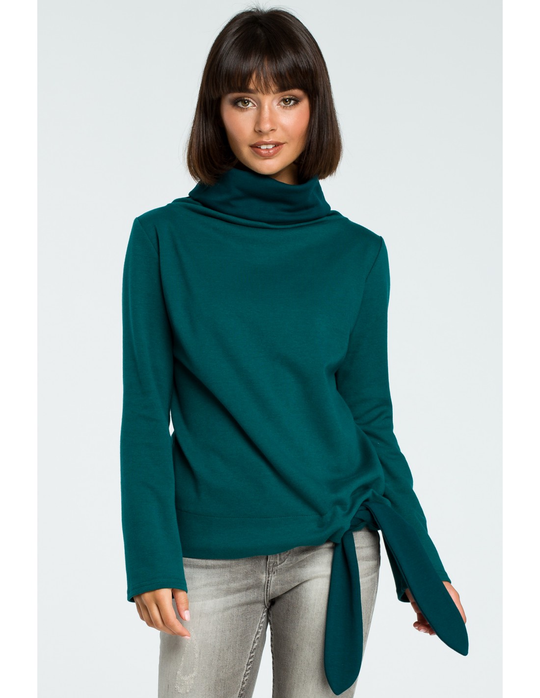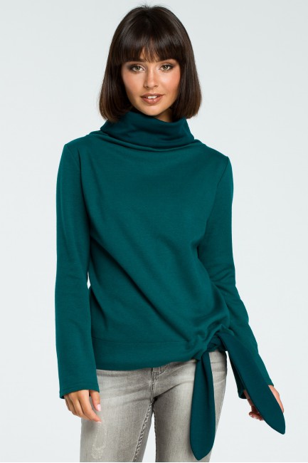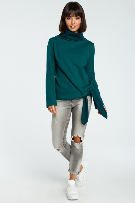Stylowa bluza damska z długim rękawem i wysokim kołnierzem. Prosty niedopasowany fason, który dzięki wiązaniu z boku, wygląda bardzo korzystnie w zestawieniu z legginsami lub jeansami. Wyprodukowano przez BE w Polsce.