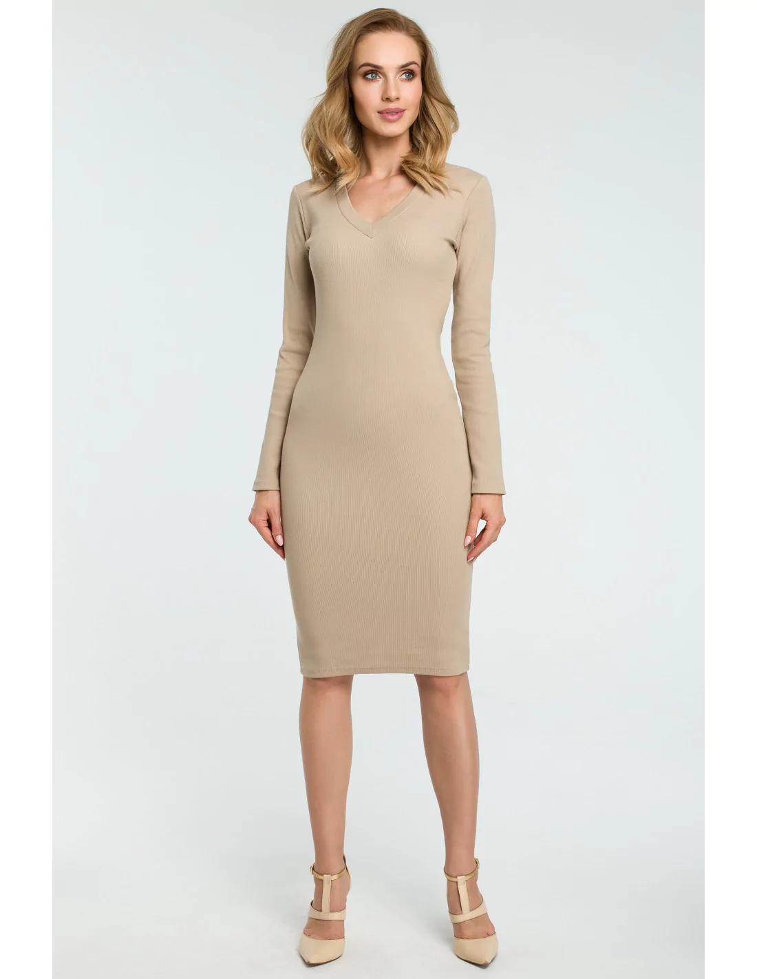 Ołówkowa sukienka z dekoltem w serek - beżowa