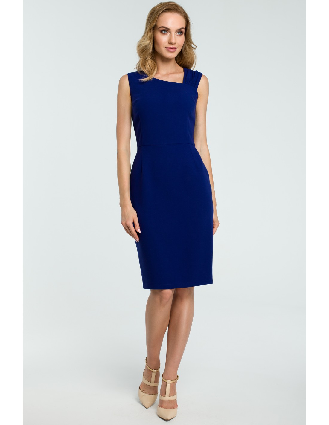 Elegancka, dopasowana sukienka, która pięknie podkreśli Twoje kształty. Niezwykle subtelna i bardzo kobieca propozycja na wyjątkowe okazje - wesele lub inne uroczystości rodzinne, bankiety czy randkę. Niebieska elegancka sukienka midi z rozporkiem na tyle będzie doskonale prezentować się z delikatnymi sandałkami lub szpilkami i kopertówką. Dekolt wycięty został po skosie i ozdobiony jednym szerokim, marszczonym ramiączkiem, natomiast na tyle sukienka ma dekolt V odsłaniający plecy. Zapięcie na zamek z tyłu zapewnia komfort podczas zakładania i zdejmowania. Odcięcie w talii pięknie ją podkreśla i wysmukla. Sukienka wyprodukowana w Polsce.