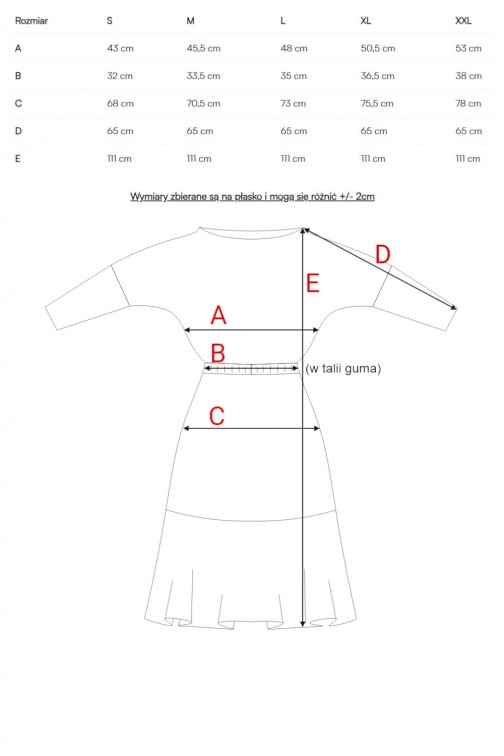 Sukienka rozkloszowana z elastyczną gumką w pasie. Model z długim rękawem o długości za kolano. Idealna na każdego rodzaju imprezę. Wyprodukowano przez BE w Polsce.