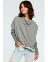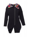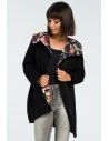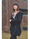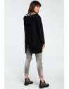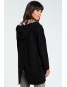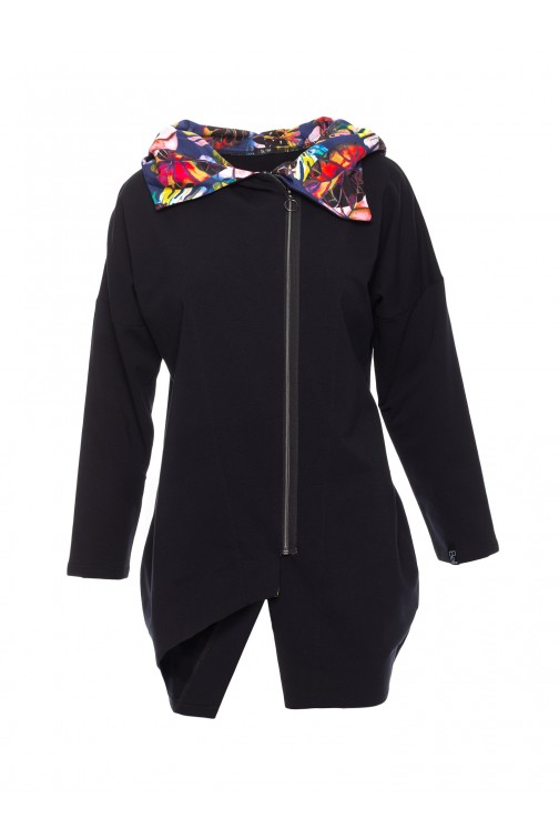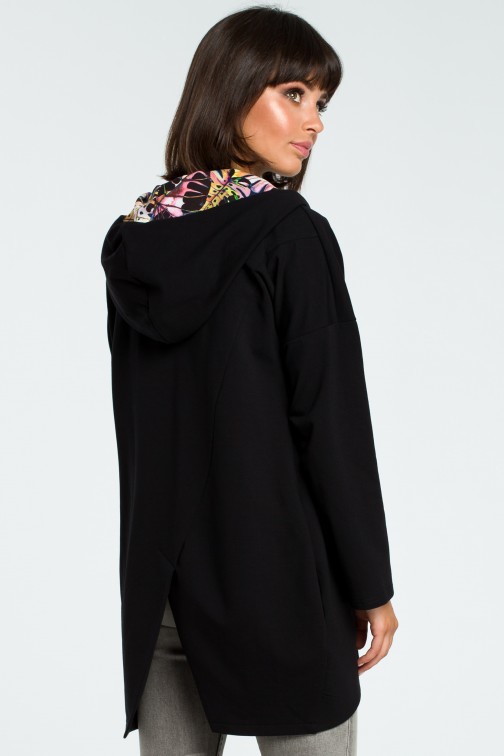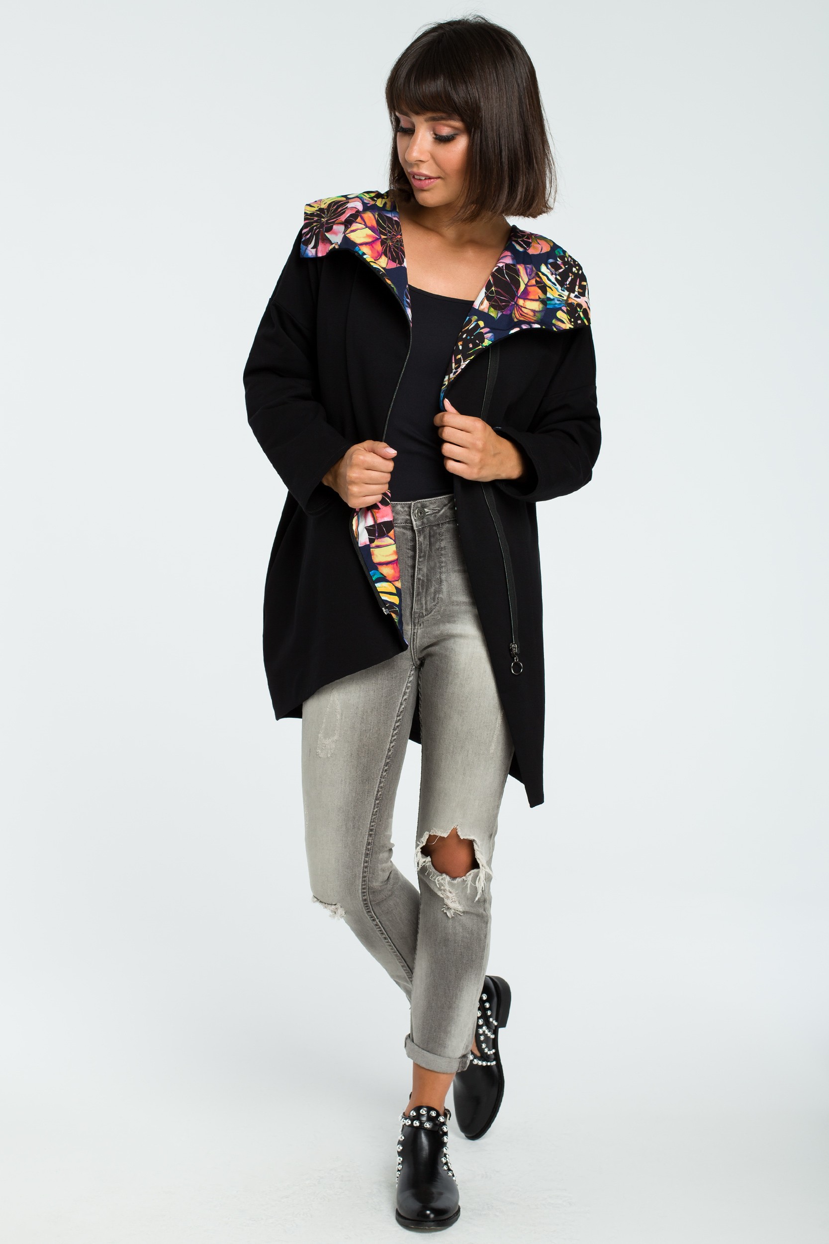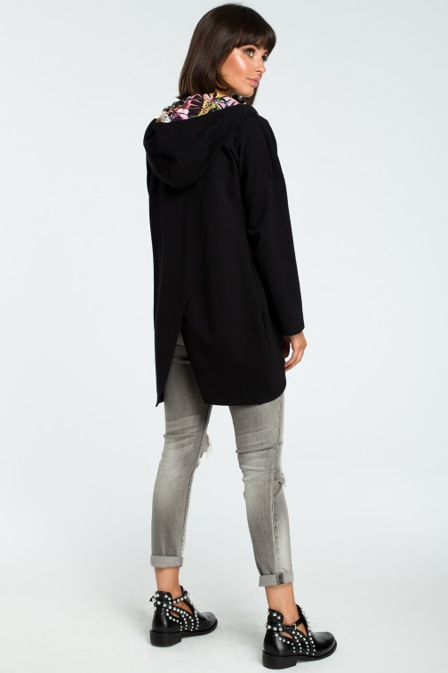 Dłuższa bluza damska z kapturem z wzorem wewnątrz. Zasuwana na zamek błyskawiczny. Model z kieszeniami po bokach, dół asymetryczny. Wyprodukowano przez BE w Polsce.