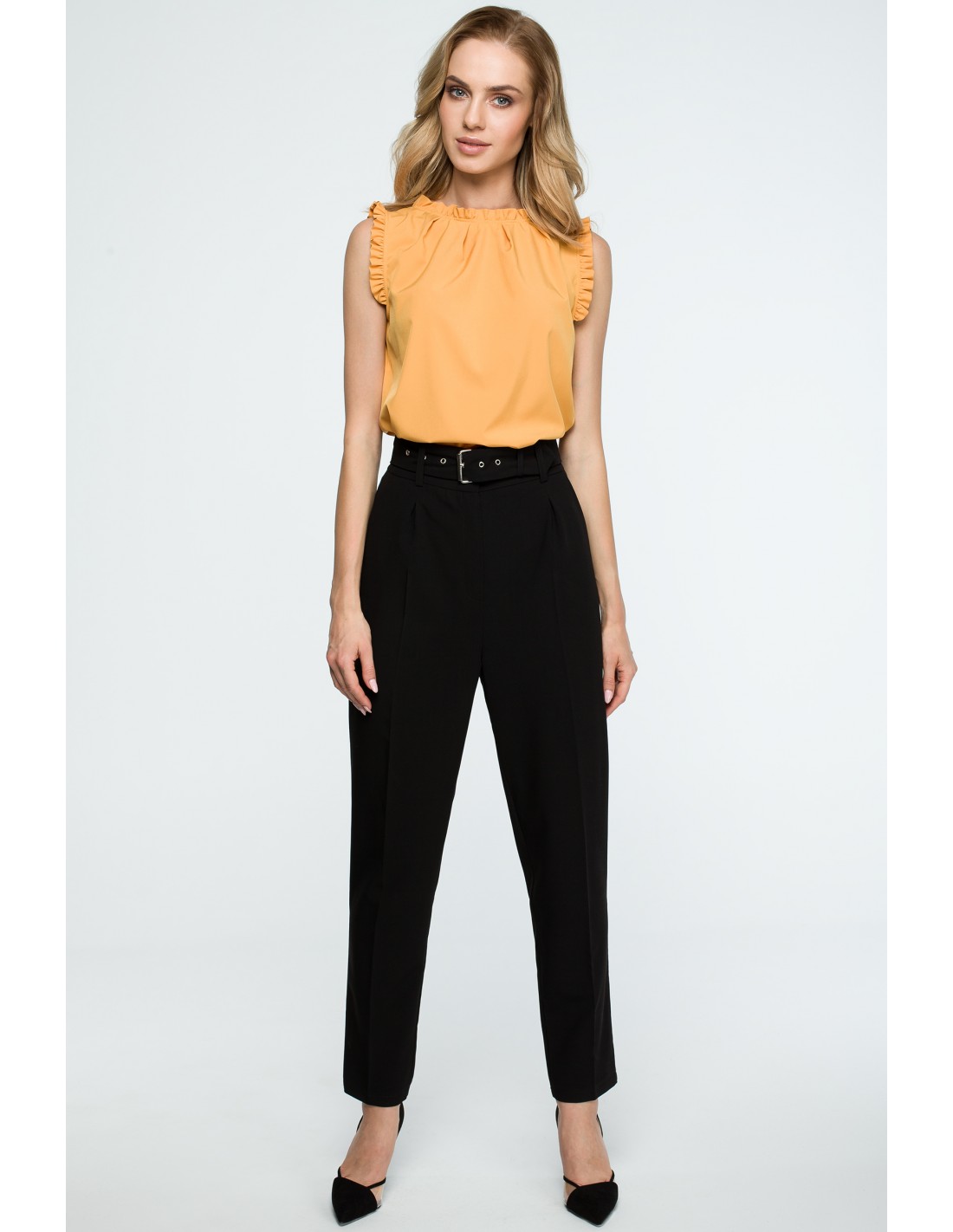 Klasyczne spodnie na kant to podstawa w każdej szafie. Te z wysokim stanem podkreślają talię, a nogawki zwężone u dołu i sięgające do kostek optycznie wydłużą nogi. Pasek z metalową sprzączką to dodatkowy modny atut. Wyprodukowano w Polsce dla Cudmoda.