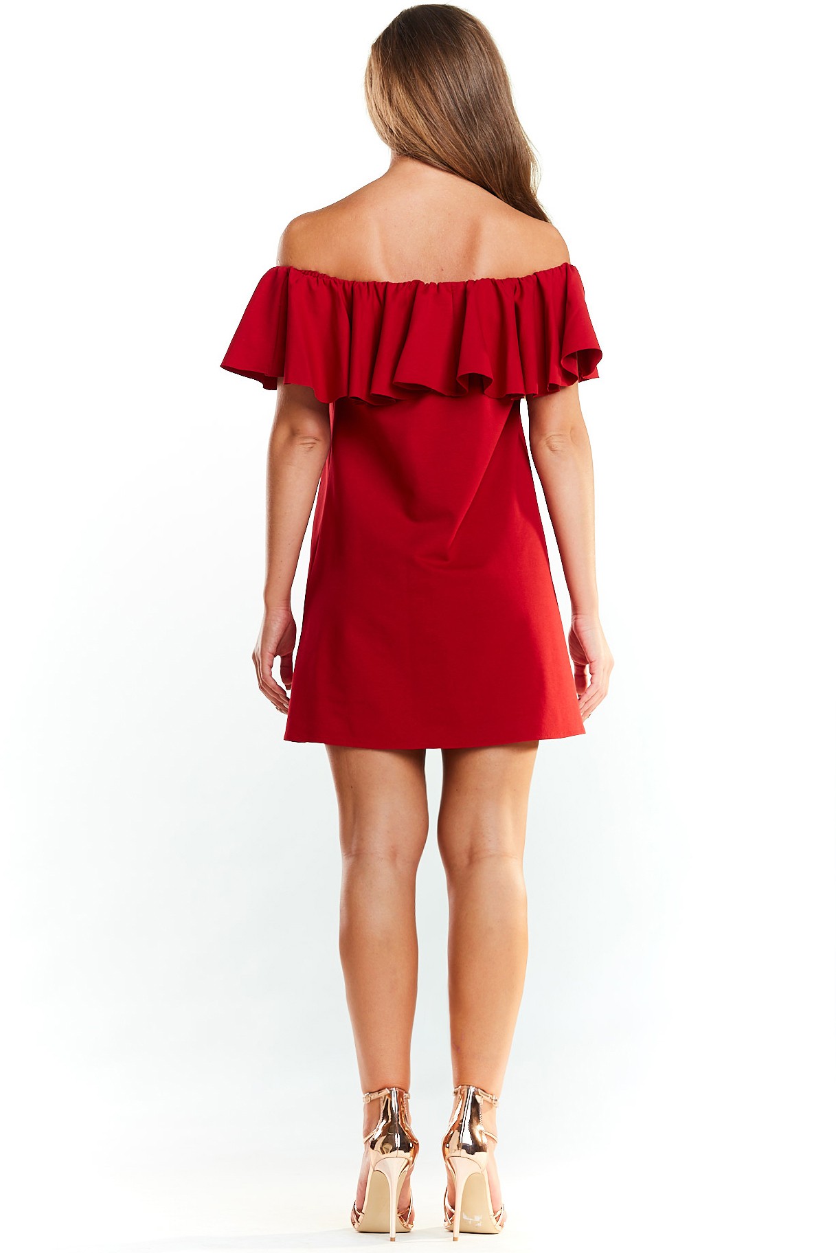 Stylowa sukienka długości mini z odkrytymi ramionami i falbanką od góry. Niezwykle elegancka sukienka idealna zarówno na wesele, jak i spotkanie wieczorowe. Wyprodukowano przez firmę Noemie w Polsce.