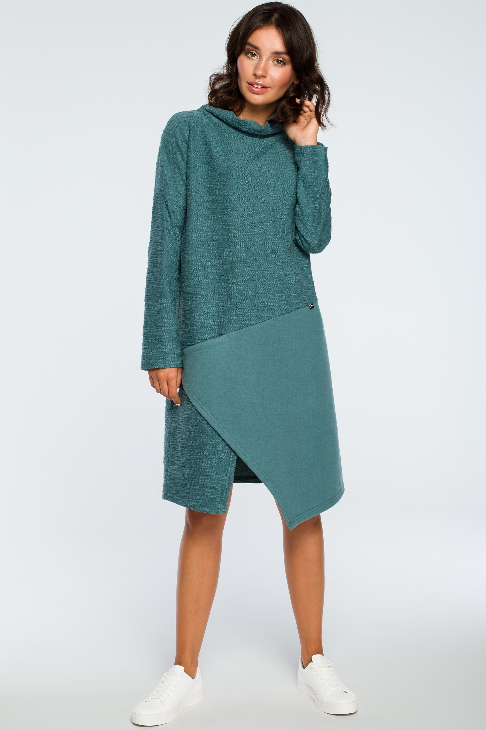 Ta lekko oversizowa sukienka z długimi rękawami i wysokim dekoltem to oryginalna dzięki asymetrycznemu fragmentowi doszytemu z przodu i praktyczna propozycja na chłodniejsze dni. Dwustronna dzianina ze strukturą warkocza z jednej i gładką drugą stroną otuli przyjemnie ciało a luźny krój nie skrepuje ruchów. Wyprodukowano przez BE w Polsce.