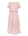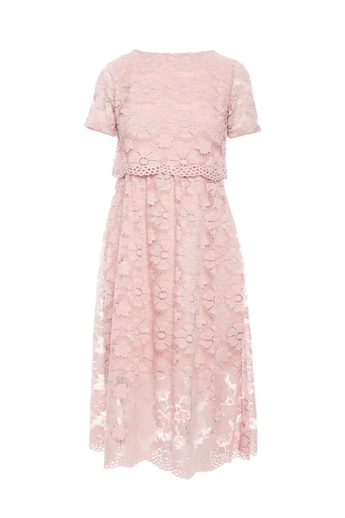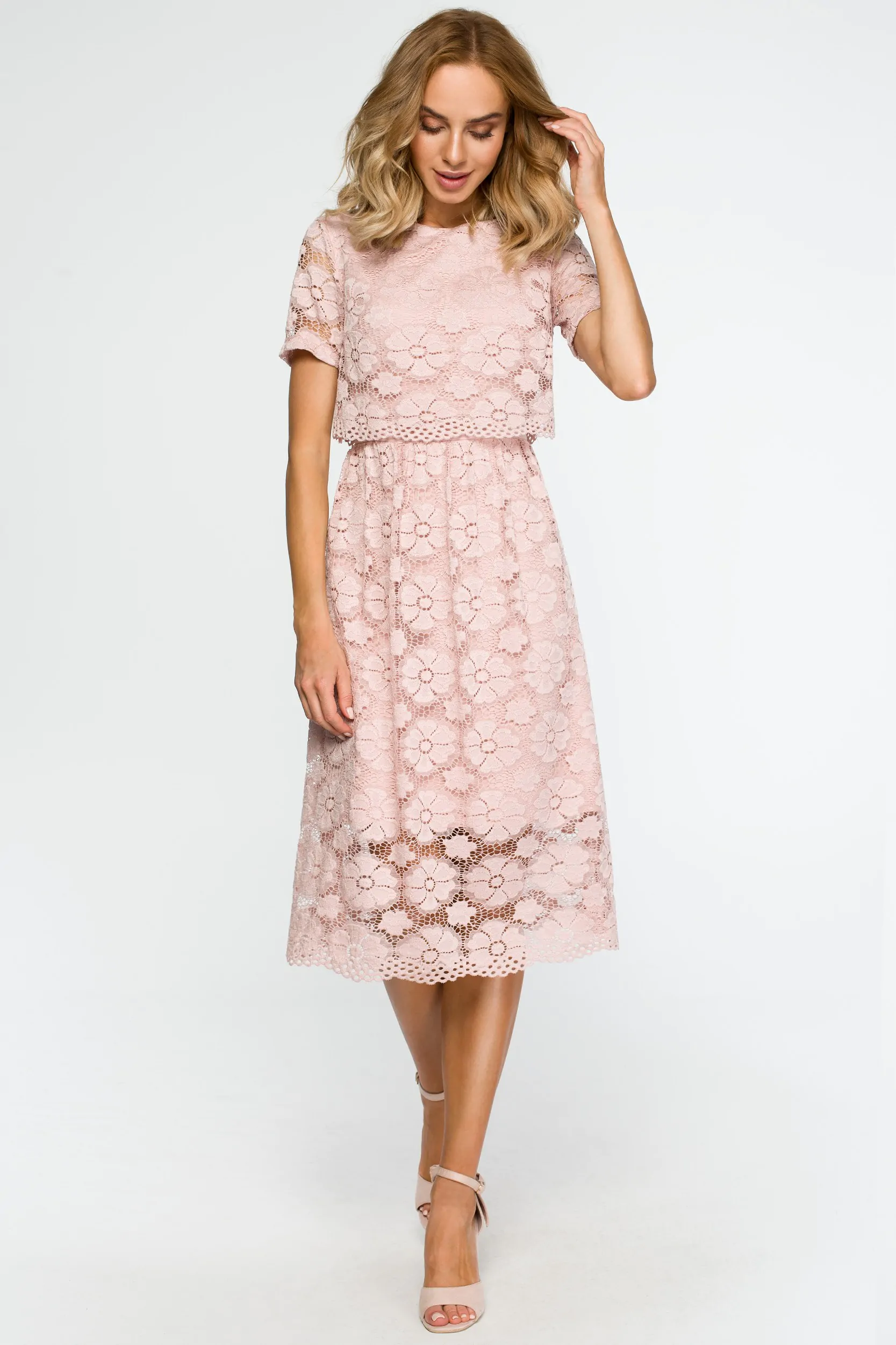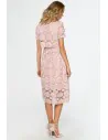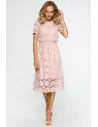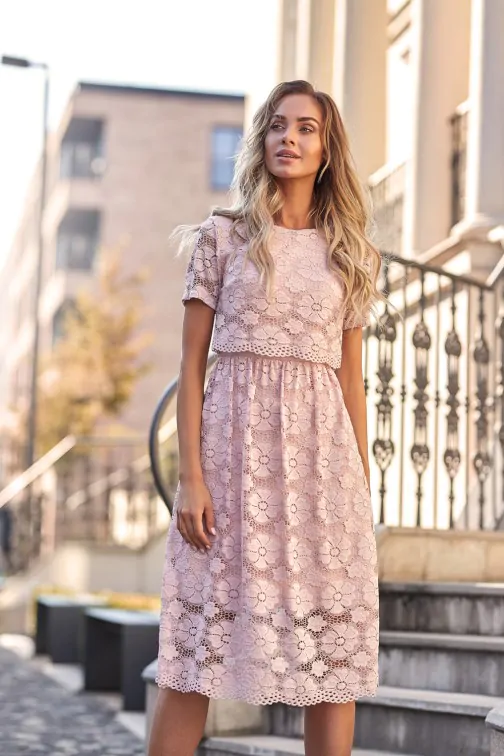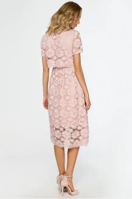 Wyjątkowa sukienka, na którą składają się dwie warstwy - krótki top i rozkloszowana, midi spódnica. Obie części połączone są ze sobą na stałe i zdecydowanie decydują o jej oryginalnym charakterze. Różowa koronkowa midi sukienka z krótkim rękawem to subtelna, pełna wdzięku i bardzo kobieca kreacja. W niej na pewno nie przejdziesz niezauważona! Prześwitujące rękawy i dół sukienki dodają lekkości i subtelnie odsłaniają ciało. Idealna kreacja na eleganckie imprezy, uroczystości rodzinne, randkę czy wieczór w restauracji. W tej sukience koronka z kwiatowym wzorem jest sama w sobie największa ozdobą, dlatego dobierz do niej minimalistyczne dodatki, żeby nie przyćmić jej uroku. Sukienka wyprodukowana w Polsce.