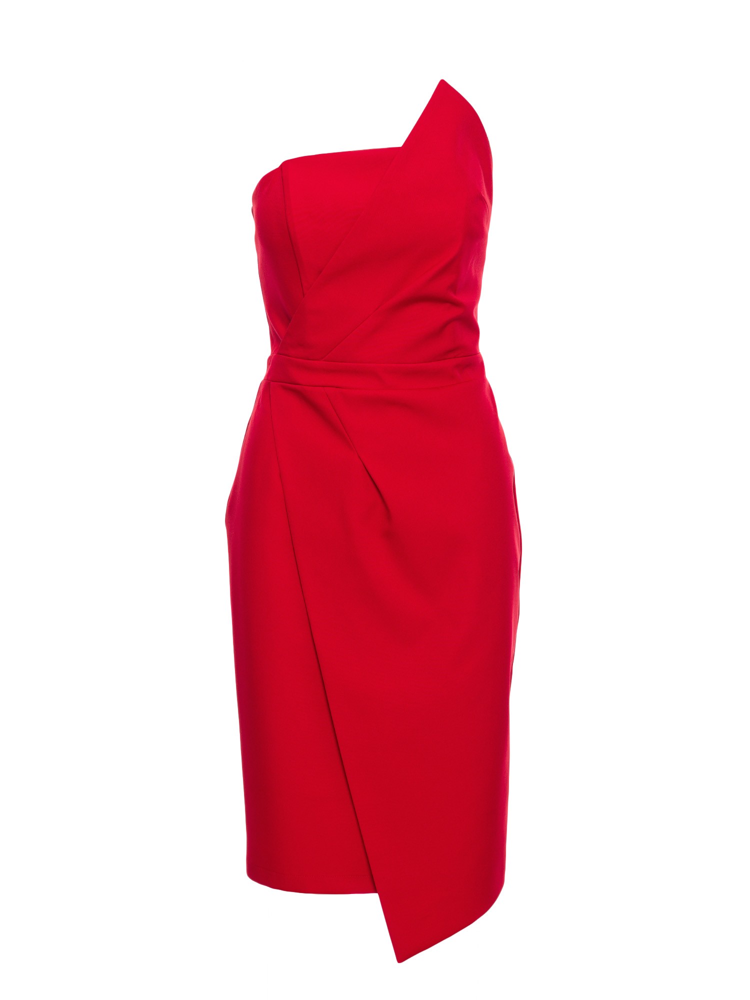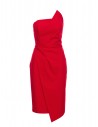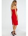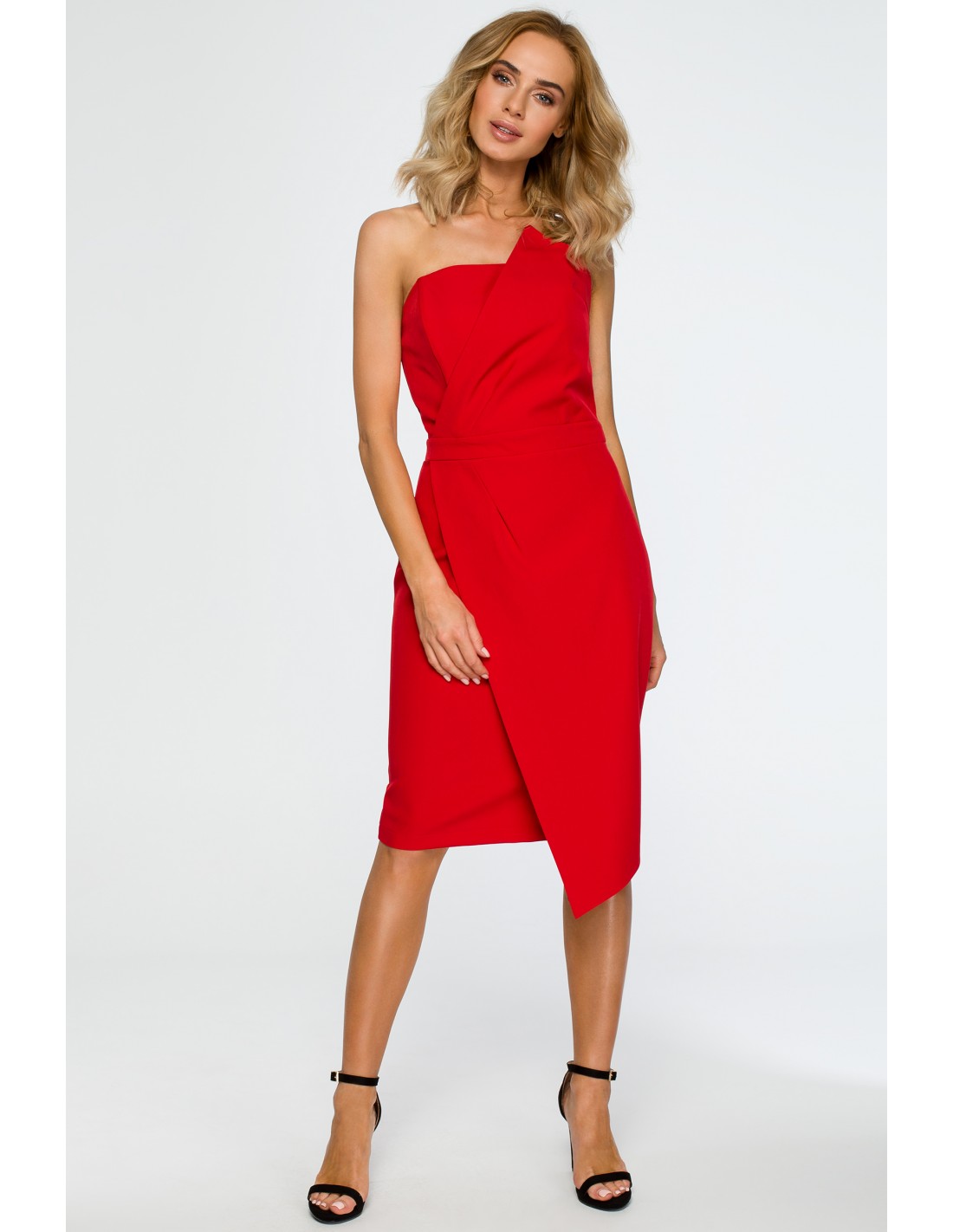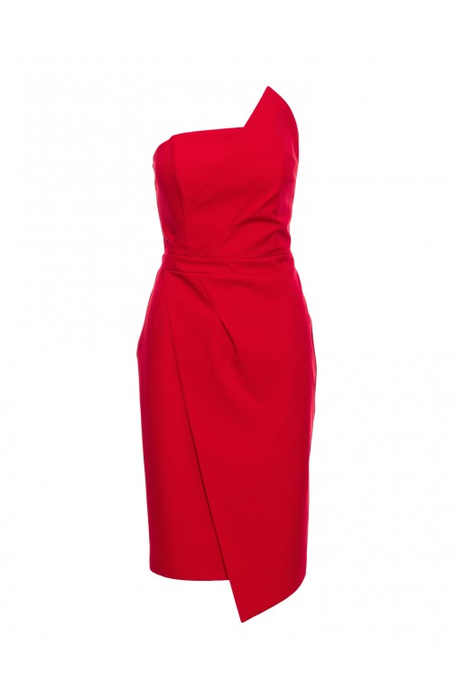 Gorsetowe sukienki modelują sylwetkę i pięknie podkreślają kobiece kształty. To bardzo eleganckie kreacje na duże przyjęcia, bale czy imprezy rodzinne. Czerwona sukienka gorsetowa o asymetrycznym kroju odsłania ramiona, a to pozwala wyeksponować biżuterię - najlepszym wyborem będą długie kolczyki lub delikatny naszyjnik. Przy tak oryginalnych krojach kieruj się zasadą “mniej znaczy więcej”. Nie można pominąć dołu sukienki, na którą składa się ołówkowa spódnica sięgająca do kolan i nieco dłuższa, biegnąca po skosie warstwa wierzchnia. Oprócz tego, że przykuwa uwagę swym asymetrycznym krojem, to za jego pomocą możesz zatuszować pewne drobne niedoskonałości sylwetki. Sukienka wyprodukowana w Polsce.