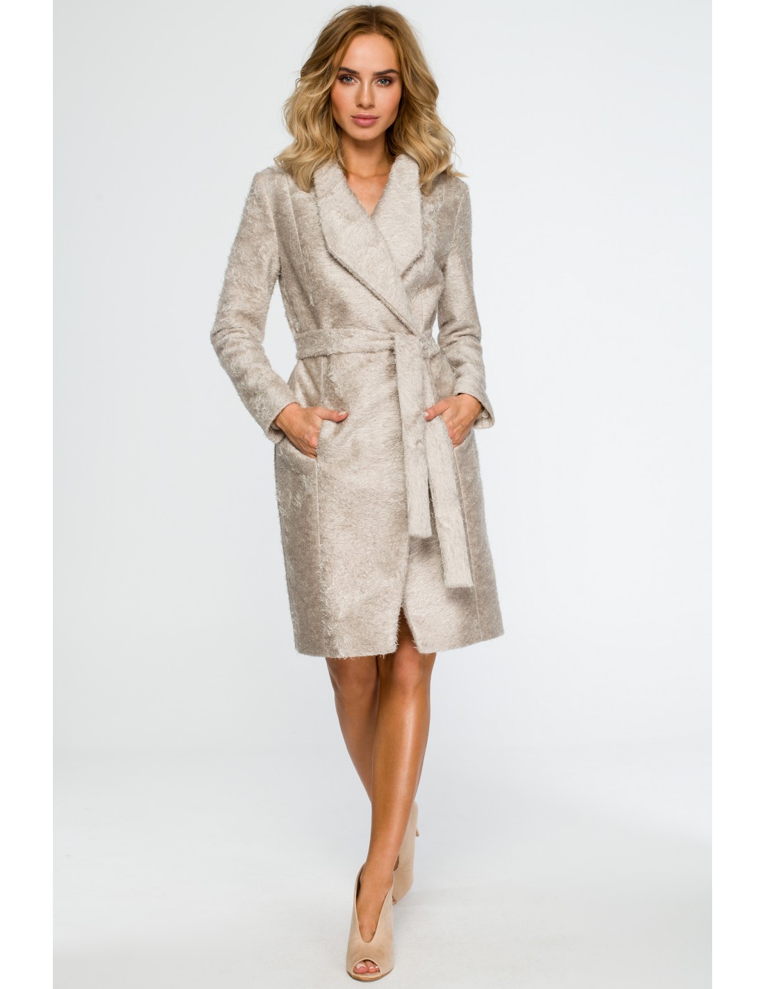 Miękki płaszcz z szalowym kołnierzem i z możliwością przewiązania paskiem sprawdzi się w chłodniejsze dni. Kołnierz można postawić lub wywinąć. Wyprodukowano przez w Polsce.