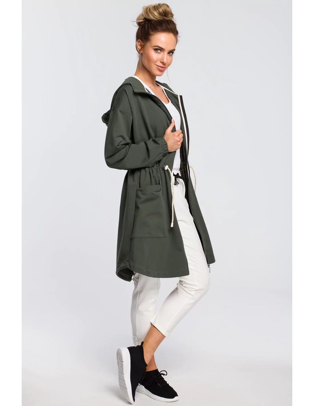 Bluza inspirowana kurtką typu parka, jest równie uniwersalna i praktyczna, a do tego możesz nosić ją przez cały rok! Ma dokładnie takie same charakterystyczne cechy - wydłużony tył, troczki w pasie, kaptur oraz naszywane kieszenie. Dlaczego właśnie ona będzie niezastąpiona w Twojej szafie? Sekret tkwi w jej kroju i wygodzie. Wydłużony tył zakrywa pośladki i biodra, co chroni przed utrata ciepła. Obszerny kaptur chroni nas przed zimnem, wiatrem i delikatnym deszczem. Ważne są również troczki, dzięki którym zaakcentujesz swoją talię. Kieszenie są nie tylko atrakcyjne wizualnie, ale są również bardzo praktyczne. Pomieszczą wszystkie drobiazgi, bez konieczności zabierania ze sobą torebki czy plecaka. Zielona bluza damska typu parka została wyprodukowana w Polsce.