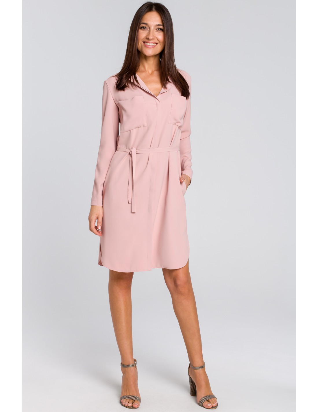 CM4133 Sukienka koszulowa z kieszeniami i paskiem - pudrowa