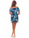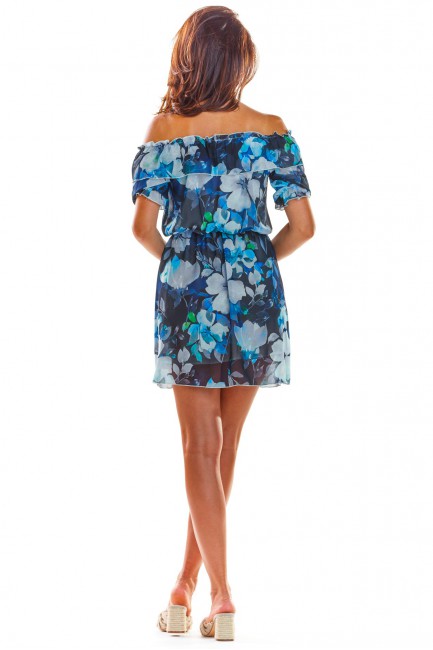 Letnia, zwiewna sukienka z dekoltem w stylu hiszpańskim z falbanką. Dekolt dodatkowo zdobi wiązanie, którym można regulować szerokość dekoltu. Rękawy dodają jej uroku. Sukienka wspaniale eksponuje ramiona. Dół sukienki jest na podszewce. Uszyta jest z delikatnego, szyfonu w charakterystyczne i modne wzory, dzięki czemu wspaniale prezentuje się podczas chodzenia oraz jest idealna na lato. Wyprodukowano przez Awama w Polsce.