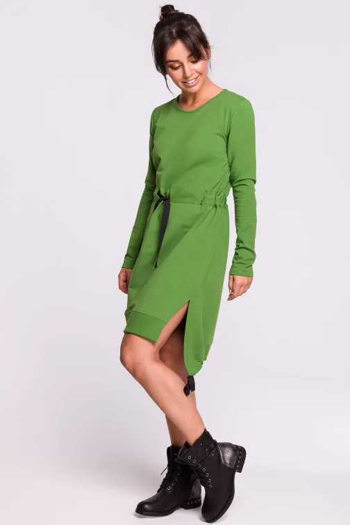 Wygodna sukienka-tunika z okrągłym dekoltem i długimi rękawami. Możesz dopasować ją do swojej sylwetki za pomocą troczków w pasie w kontrastującym kolorze. Uwagę zwracają charakterystyczne duże rozcięcia po bokach i asymetryczne zakończenie przodu i tyłu. Wyprodukowano w Polsce.