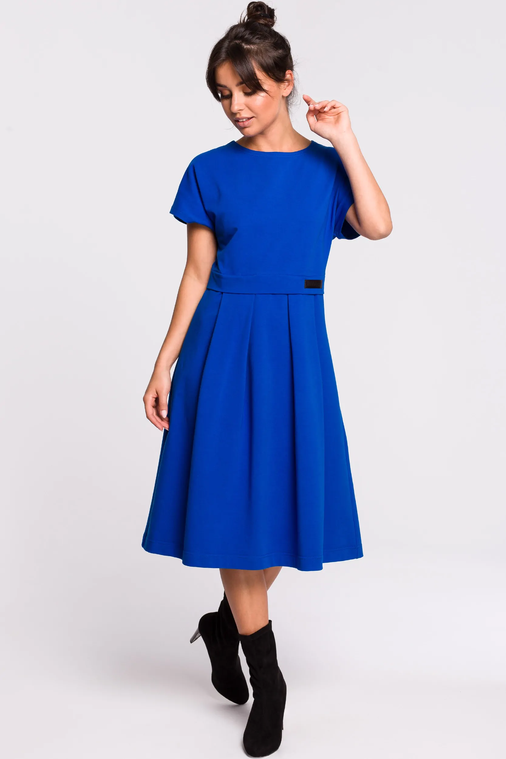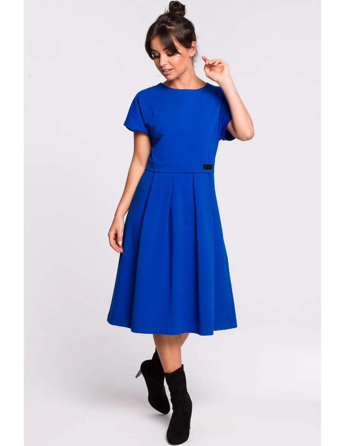 Luźna sukienka z wyraźnie oddzieloną linią talii, dzięki czemu sprawia wrażenie jakby była złożona z dwóch osobnych części. Klasyczna góra z krótkimi rękawami i okrągłym dekoltem, oraz spódnica z kontrafałdami nadają jej dziewczęcego charakteru. Idealna do noszenia na co dzień. Wyprodukowano w Polsce.