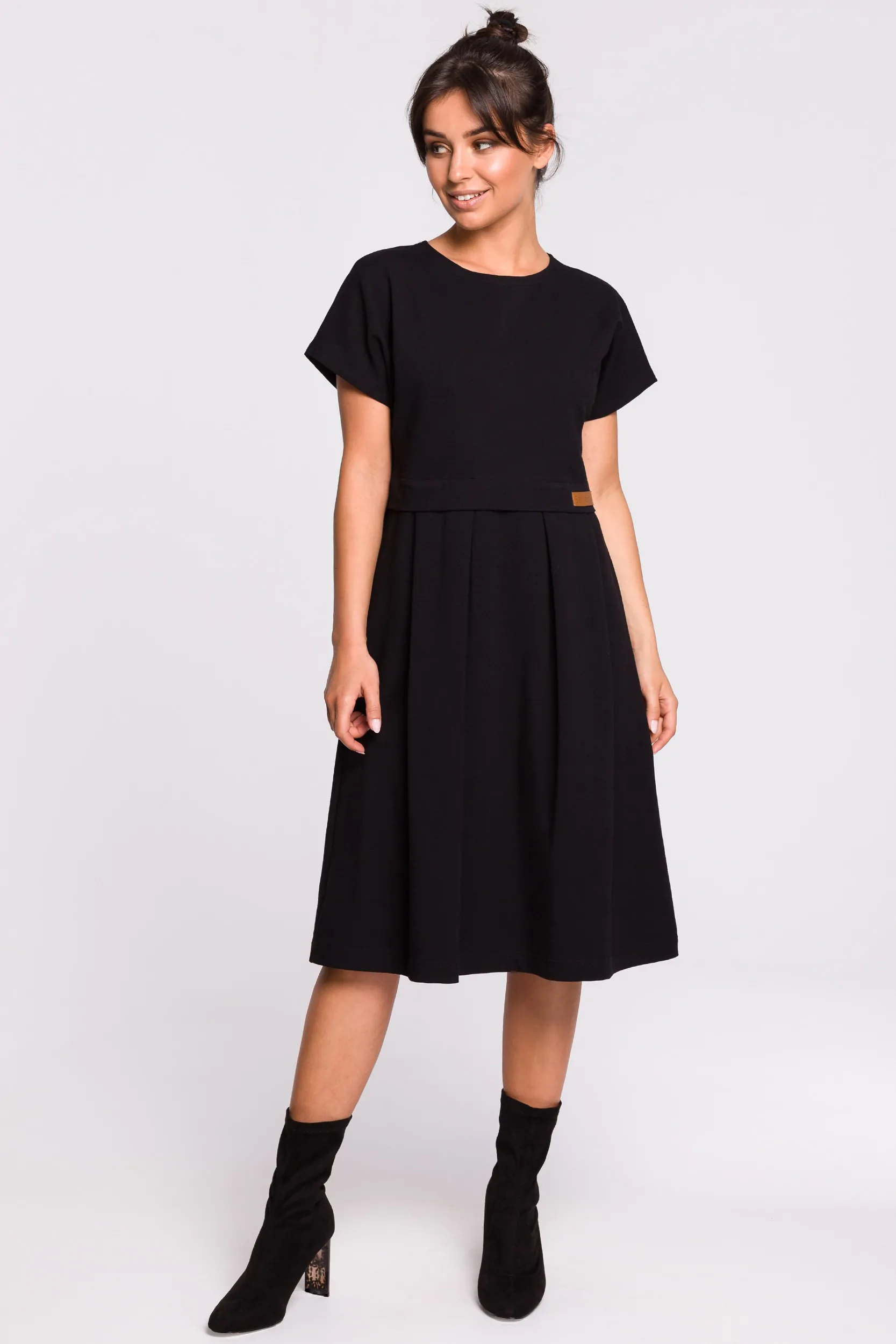 Luźna sukienka z wyraźnie oddzieloną linią talii, dzięki czemu sprawia wrażenie jakby była złożona z dwóch osobnych części. Klasyczna góra z krótkimi rękawami i okrągłym dekoltem, oraz spódnica z kontrafałdami nadają jej dziewczęcego charakteru. Idealna do noszenia na co dzień. Wyprodukowano w Polsce.
