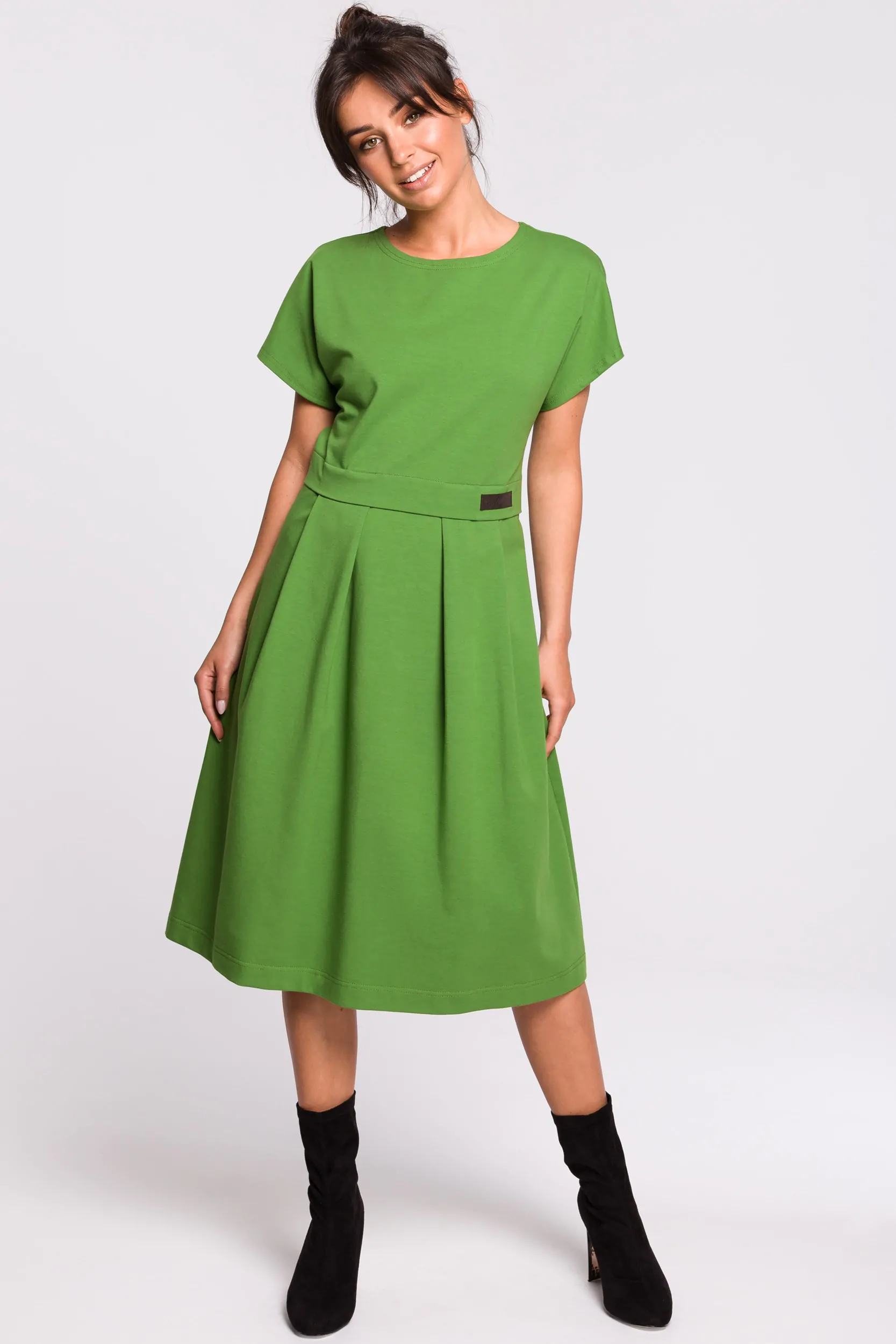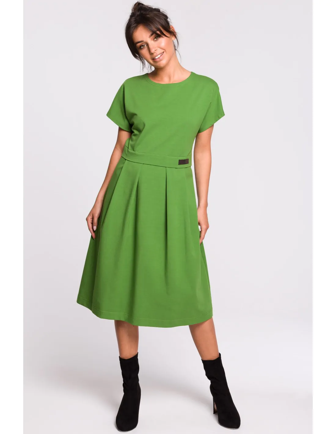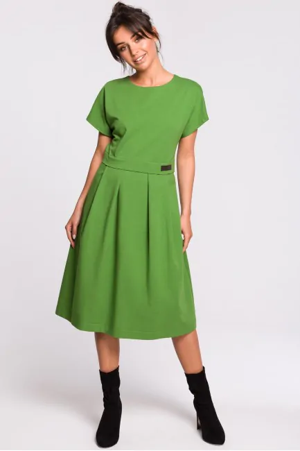 Luźna sukienka z wyraźnie oddzieloną linią talii, dzięki czemu sprawia wrażenie jakby była złożona z dwóch osobnych części. Klasyczna góra z krótkimi rękawami i okrągłym dekoltem, oraz spódnica z kontrafałdami nadają jej dziewczęcego charakteru. Idealna do noszenia na co dzień. Wyprodukowano w Polsce.