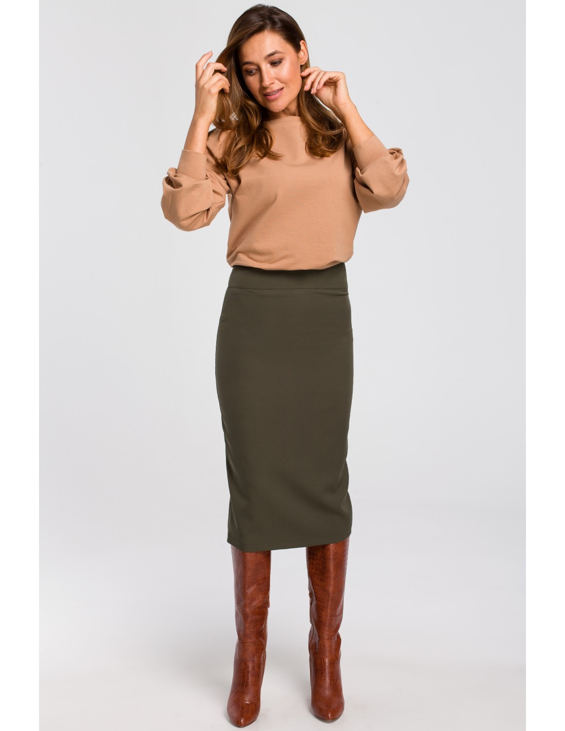 Jeśli potrzebujesz czasem odmienić swój look i zamienić spodnie na spódnicę, to ołówkowa spódnica zawsze sprawdzi się doskonale! To łatwy sposób na kobiecą, pełną uroku stylizację. Klasyczna spódnica ołówkowa z karczkiem w kolorze khaki to model o dopasowanym kroju, który podkreśli Twoje atuty w najlepszy sposób! Stylizacja z nią nie może się nie udać! Wystarczy dodać do niej Twoją ulubioną bluzkę lub koszulę. Dopasowana spódnica o długości midi prezentuje się bardzo elegancko, świetnie sprawdza się w stylizacjach do pracy czy na oficjalne spotkanie. na tyle widoczny jest rozporek oraz zapięcie na kryty zamek. Spódnica wyprodukowana została w Polsce.
