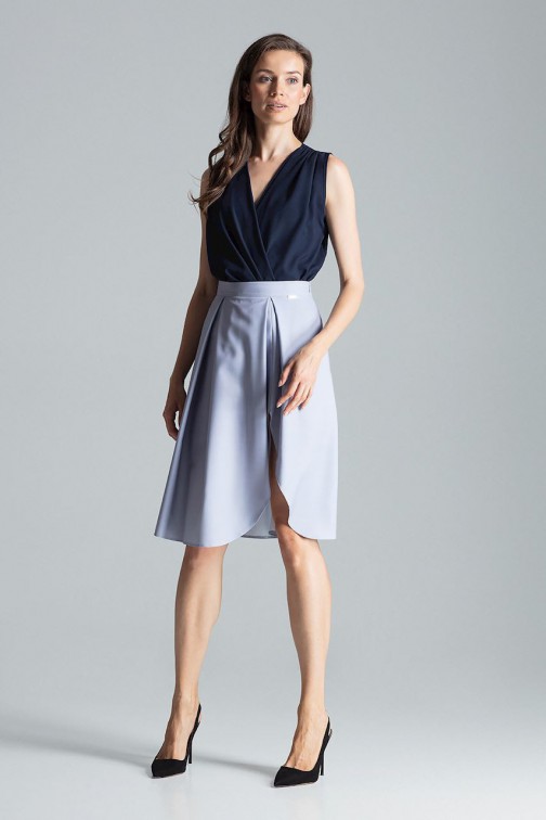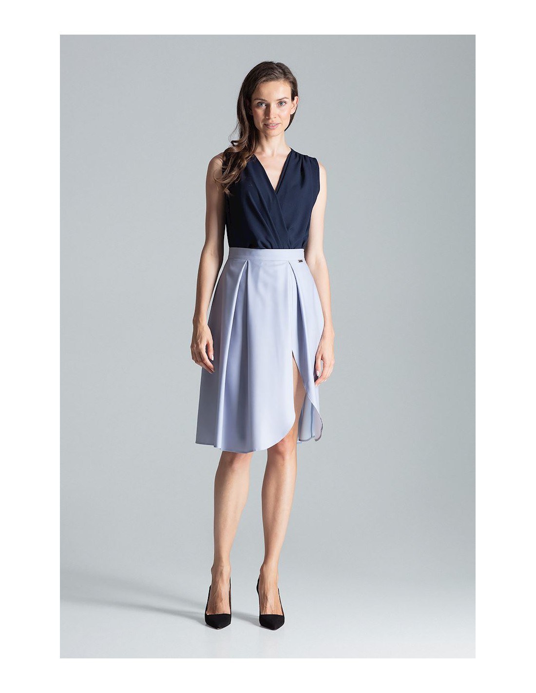 Spódniczka w kształcie litery A długości midi. Niezwykle elegancka i kobieca spódniczka bez podszewki w delikatne kontrafałdy. Na lewej nodze - asymetryczne rozcięcie. Wyprodukowano przez FIGL w Polsce.