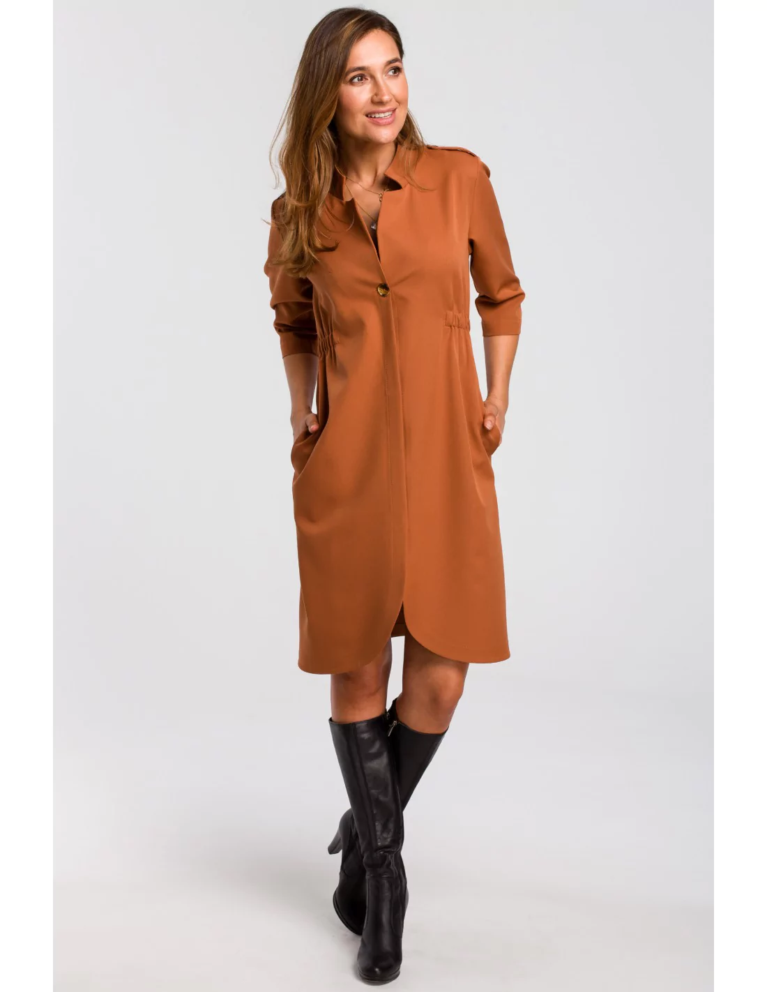 Elegancka sukienka o żakietowym kroju. Jej wyjątkowy fason sprawi, że zawsze wtedy, kiedy będziesz miała ją na sobie zrobisz wrażenie! Na przodzie znajduje się plisa, która pod spodem kryje zapięcie na napy, a na zewnątrz widoczny jest jeden ozdobny guzik. Gumka w tylnej części tworzy ciekawą formę i genialnie wyrównuje proporcje sylwetki. Dekolt V ze stójką możesz ozdobić swoim ulubionym łańcuszkiem z zawieszką. Na ramionach pagony zapinane na guzik. Dół sukienki został wycięty na półokrągło z wycięciem na przodzie. Sukienka żakietowa to gwarancja stylowego looku na każdą okazję. Ruda sukienka żakietowa z gumką wyprodukowana w Polsce.