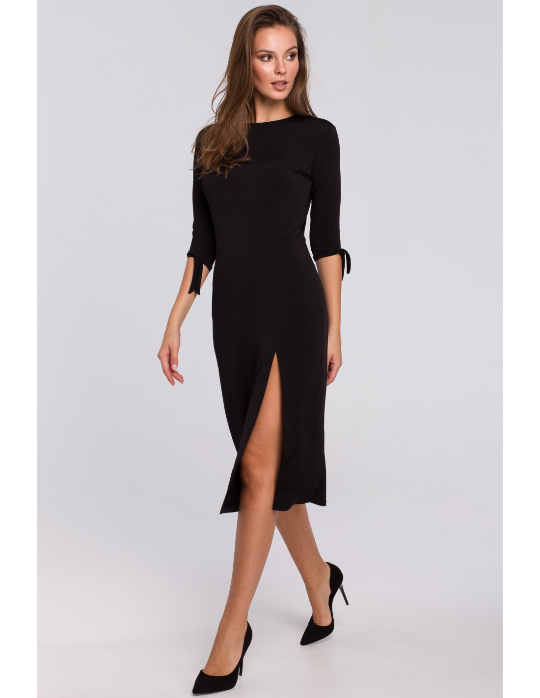 Wyjątkowa propozycja dla kobiet, które uwielbiają podkreślać swoje atuty! Dopasowana sukienka zrobi to doskonale! Wykonana z miękko układającej się na ciele dzianiny z domieszką elastanu, dzięki czemu zyskuje na elastyczności, a Tobie nie ogranicza ruchów. Wzbogacona o efektowne rozcięcie na przodzie eksponujące nogę oraz paski przy rękawach, które możesz wiązać według swoich upodobań. Talia wyraźnie zaznaczona. Czarna sukienka z wiązanymi rękawami potrzebuje wysokich obcasów - wydłużysz i wysmuklisz swoją sylwetkę maksymalnie! Dopasowana sukienka z rozporkiem wyprodukowana w Polsce.