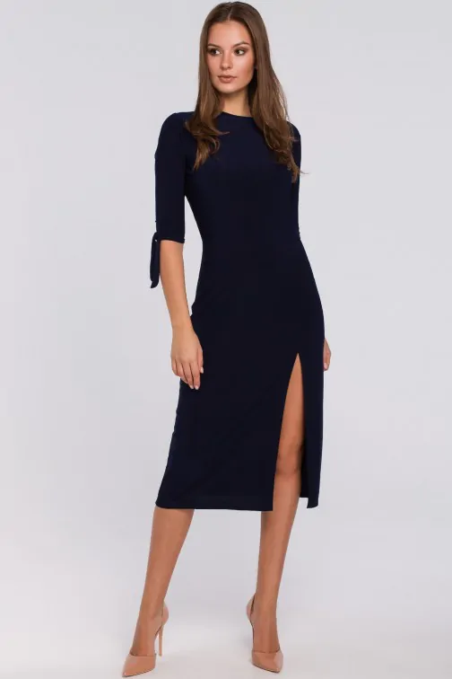 Wyjątkowa propozycja dla kobiet, które uwielbiają podkreślać swoje wdzięki! Dopasowana sukienka zrobi to doskonale! Wykonana z miękko układającej się na ciele dzianiny z domieszką elastanu, dzięki czemu zyskuje na elastyczności, a Tobie nie ogranicza ruchów. Wzbogacona o efektowne rozcięcie na przodzie eksponujące nogę oraz paski przy rękawach, które możesz wiązać według swoich preferencji. Talia wyraźnie zaznaczona. Granatowa sukienka z wiązanymi rękawami potrzebuje wysokich obcasów - wydłużysz i wysmuklisz swoją sylwetkę maksymalnie! Dopasowana sukienka z rozporkiem wyprodukowana w Polsce.