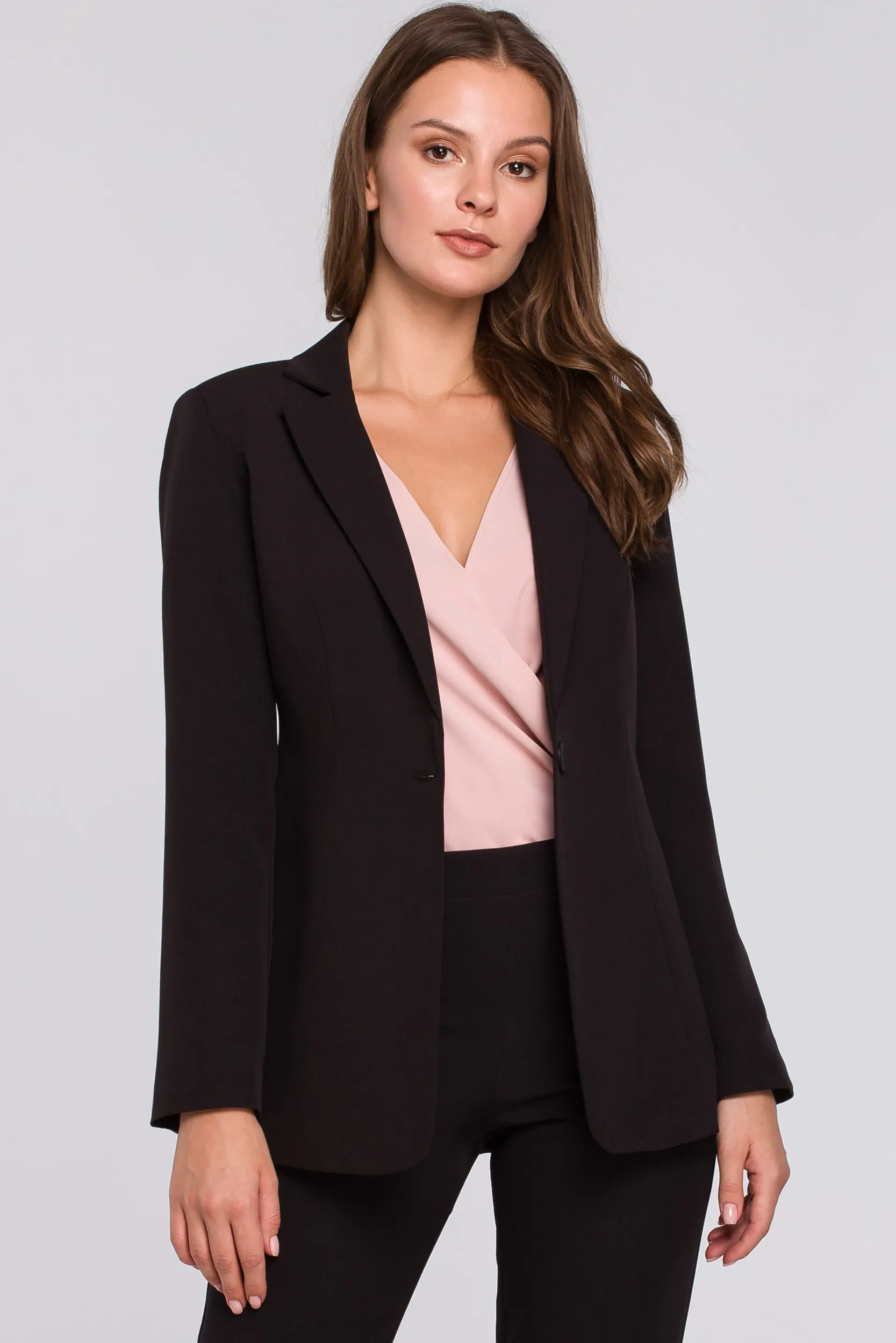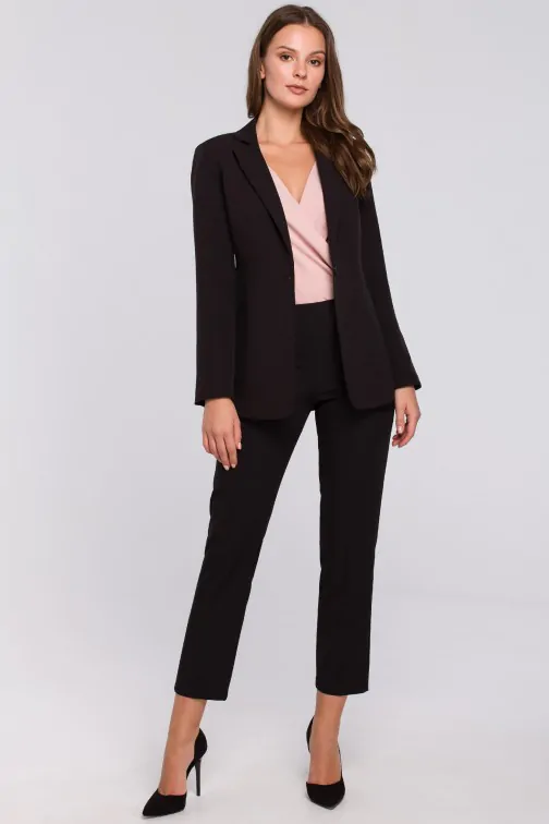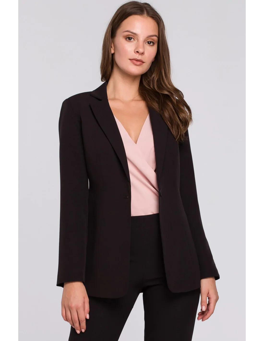 Elegancki żakiet, który stworzyliśmy z ogromną dbałością o szczegóły, dlatego tak perfekcyjnie układa się na sylwetce. Żakiet zapinany na guzik posiada klasyczny, lekko taliowany fason, wykładany kołnierz oraz w całości jest na podszewce. Ten elegancki czarny żakiet to nie tylko element biurowych stylizacji, choć w tej roli sprawdzi się znakomicie. Możesz nosić go zarówno do pracy, na wyjątkowe uroczystości, jak i na co dzień. Jedną z naszych propozycji jest zestawienie ze spodniami typu cygaretki z kantem, które znajdziesz w naszej ofercie - te w identycznym kolorze stworzą modny total look! Żakiet wyprodukowany w Polsce.