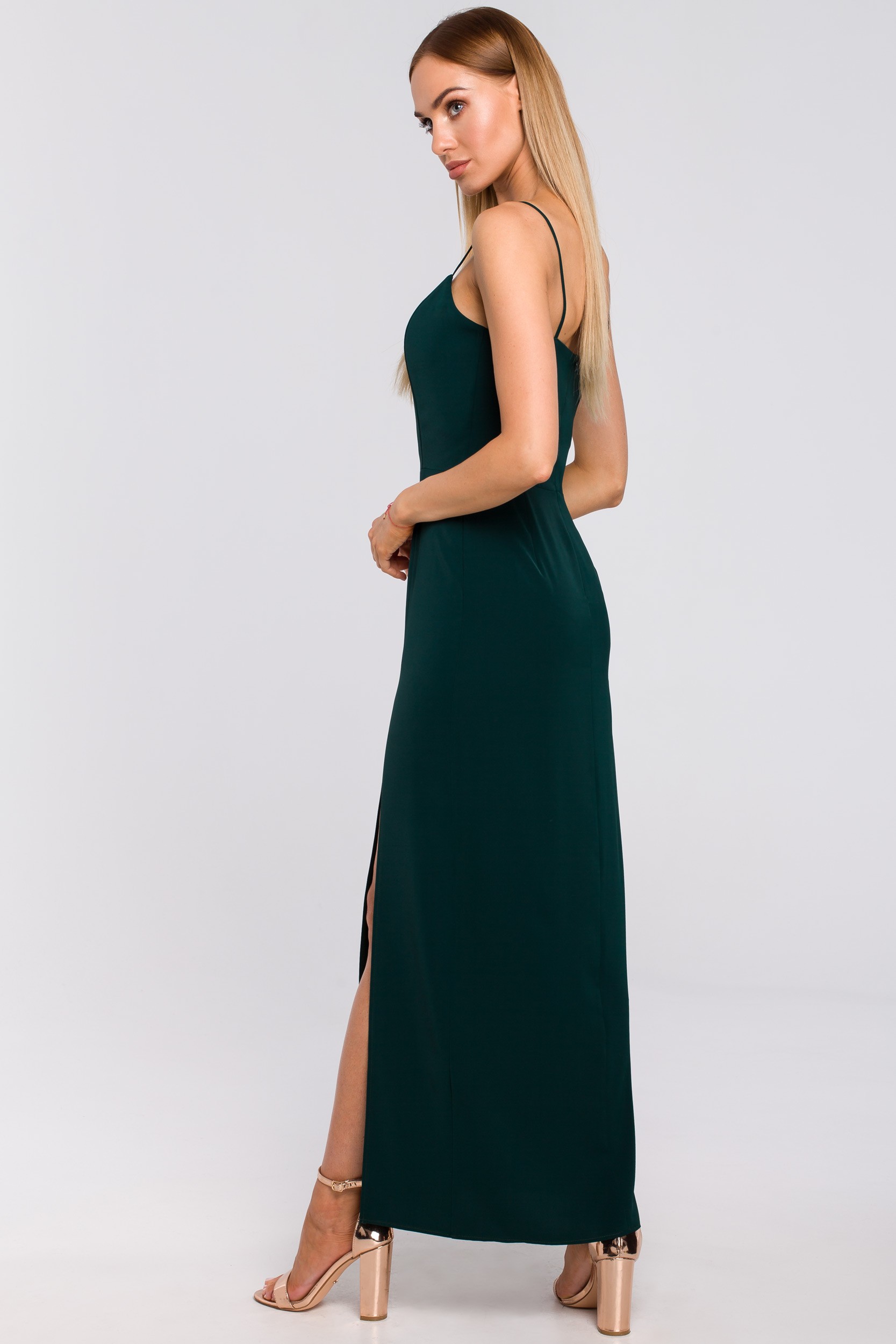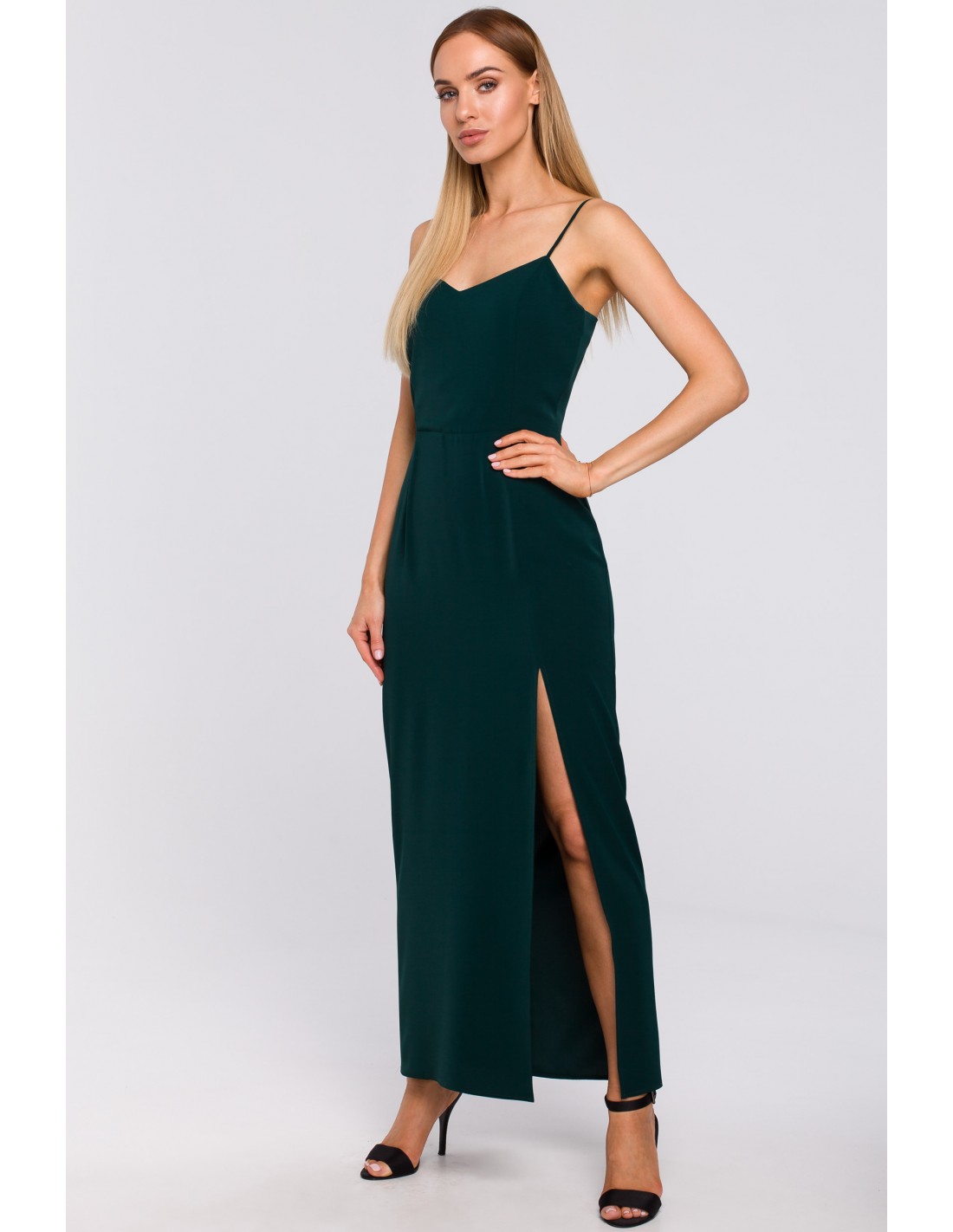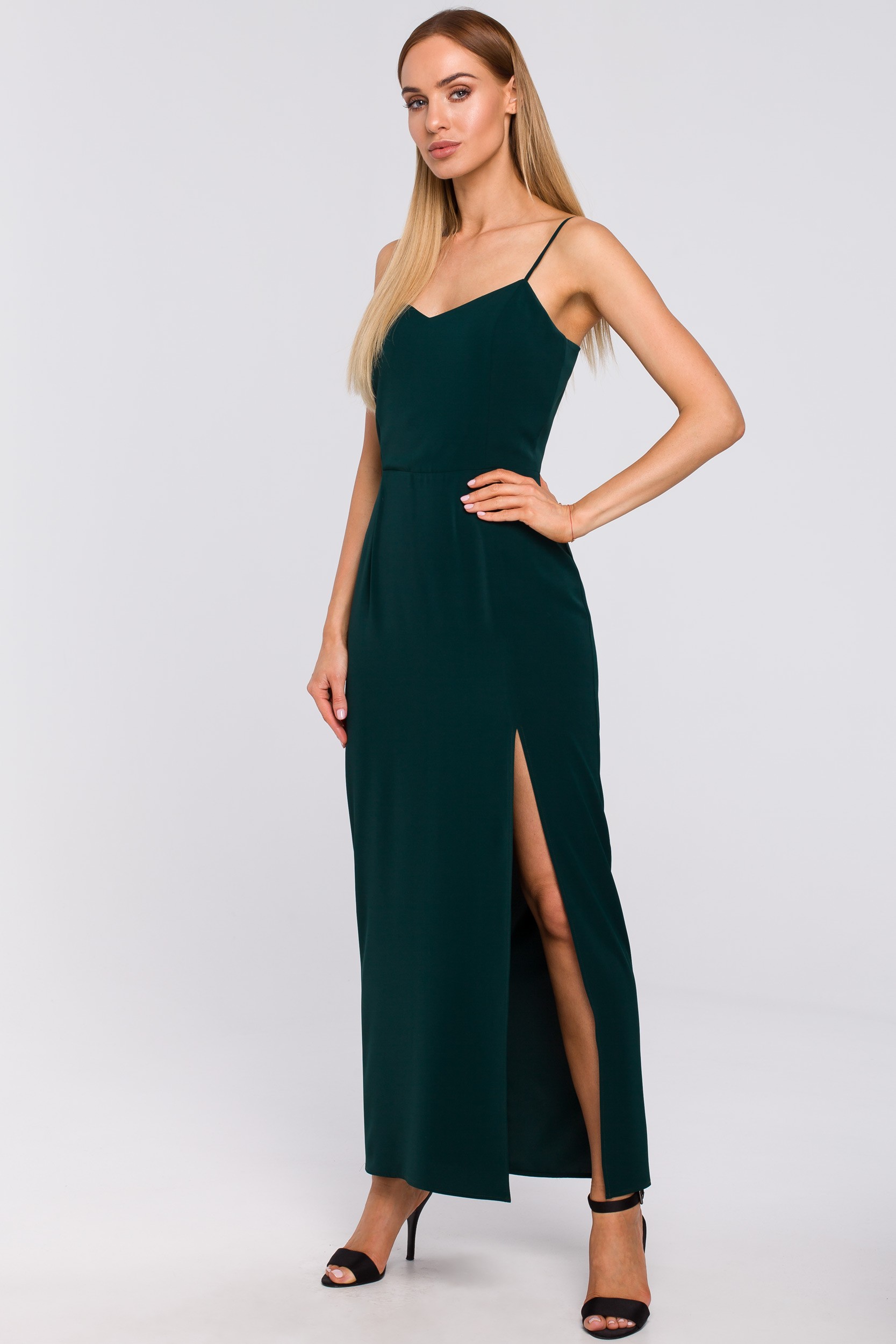 Eksponuje ramiona, dodaje seksapilu i sprawia, że możemy poczuć się bardzo kobieco i wyjątkowo. Mowa o zielonej maxi sukience na cienkich ramiączkach. Wieczorowa sukienka z efektownym rozporkiem na nodze to model wprost doskonały na wesela, gale, eventy firmowe czy inne eleganckie uroczystości. Taką kreację wystarczy połączyć z sandałkami na szpilce, kopertówką do ręki i efektowną biżuterią, by wyglądać olśniewająco! Delikatne, cienkie ramiączka są bardzo subtelnym elementem, który dodaje lekkości długiej sukience. Mimo długości prezentuje się lekko, a nie przytłacza ciężkością. Odcięcie i zwężenie w pasie pięknie akcentuje talię, zaznaczając kobiece kształty. Dajemy Ci gwarancję, że w takiej sukience będziesz wyglądać jak milion dolarów! Model wyprodukowany w Polsce.