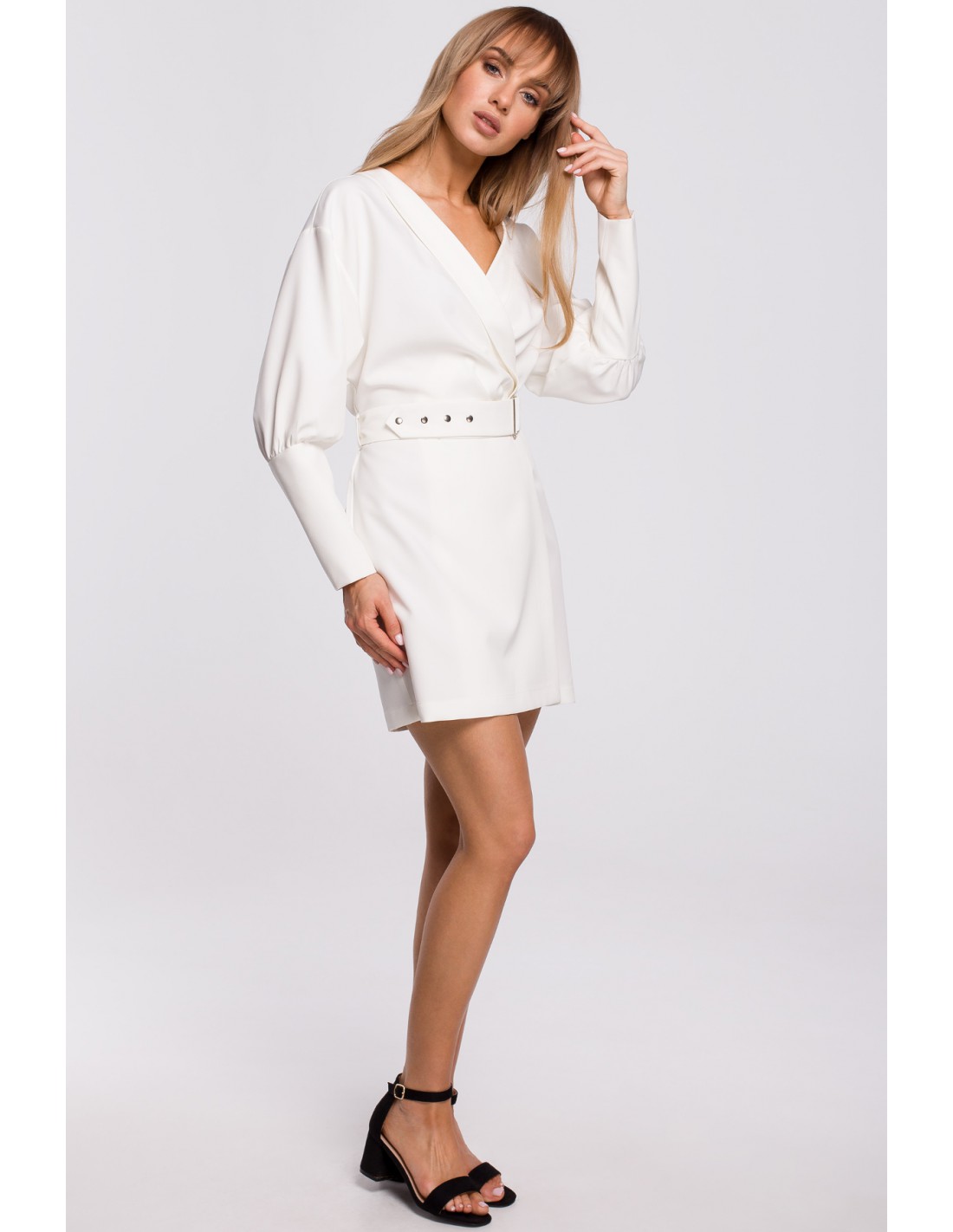 CM5208 Sukienka z bufiastymi rękawami i paskiem - ecru