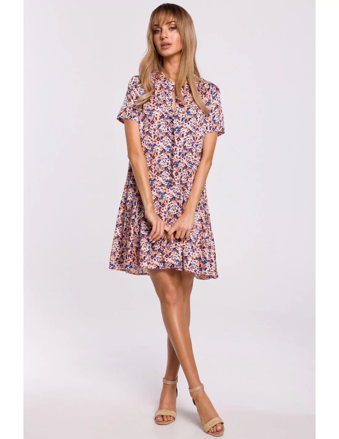 Rozkloszowana sukienka z printem to propozycja, którą prawdziwa miłośniczka motywów florystycznych powinna mieć w swojej kolekcji! Otóż to niesłabnący od kilku sezonów trend w modzie. Zachwyca lekkością i kobiecością, a delikatnie połyskująca tkanina pięknie mieni się w słońcu. Sukienka w kształcie A świetnie wygląda na każdej sylwetce, bardzo dobrze maskuje również jej drobne mankamenty. Możesz ją nosić do pracy, na niedzielny spacer, spotkania w rodzinnym gronie, imprezy plenerowe, a nawet wesela. Doskonale wygląda z sandałkami na wysokim bądź też niższym obcasie. Do tego dodatki typu kolczyki, bransoletka, mała torebka i jesteś gotowa na wielkie wyjścia. W codziennym wydaniu postaw na klapki na płaskiej podeszwie lub słupku, czy też wiązane sandałki. Sukienka wyprodukowana w Polsce.