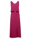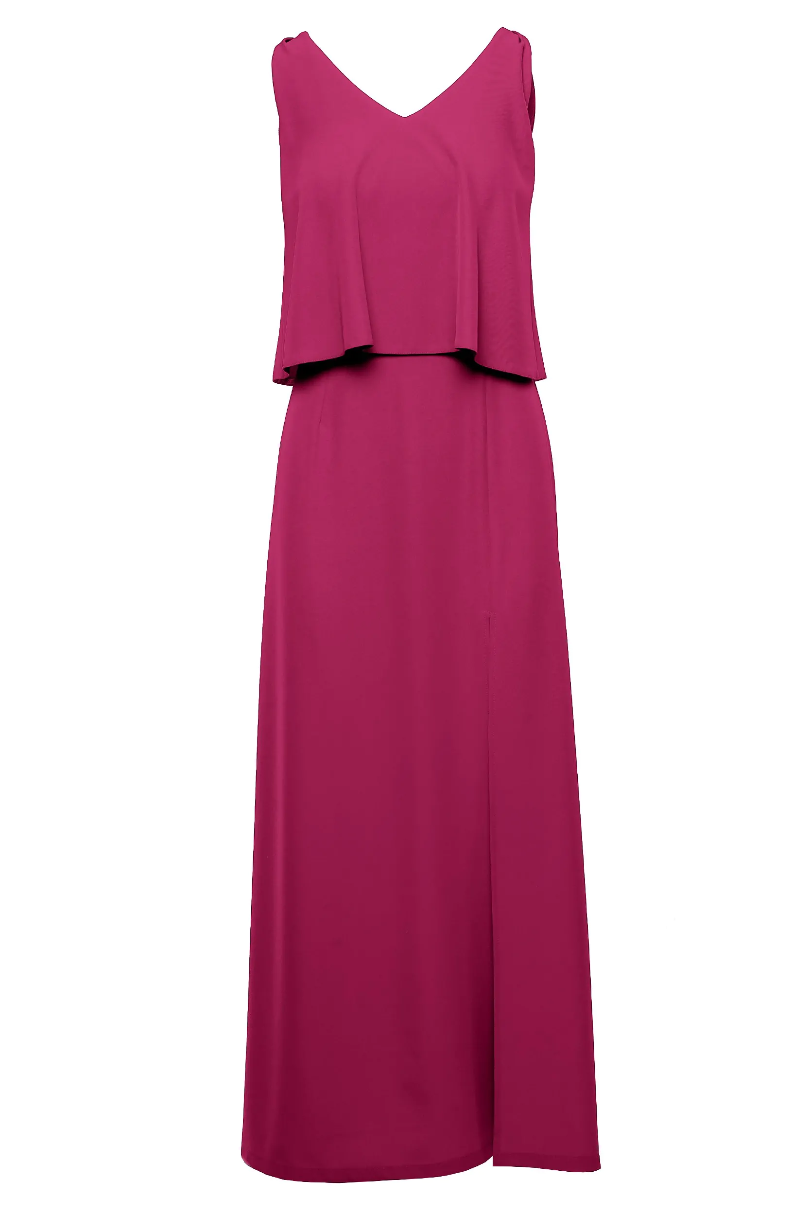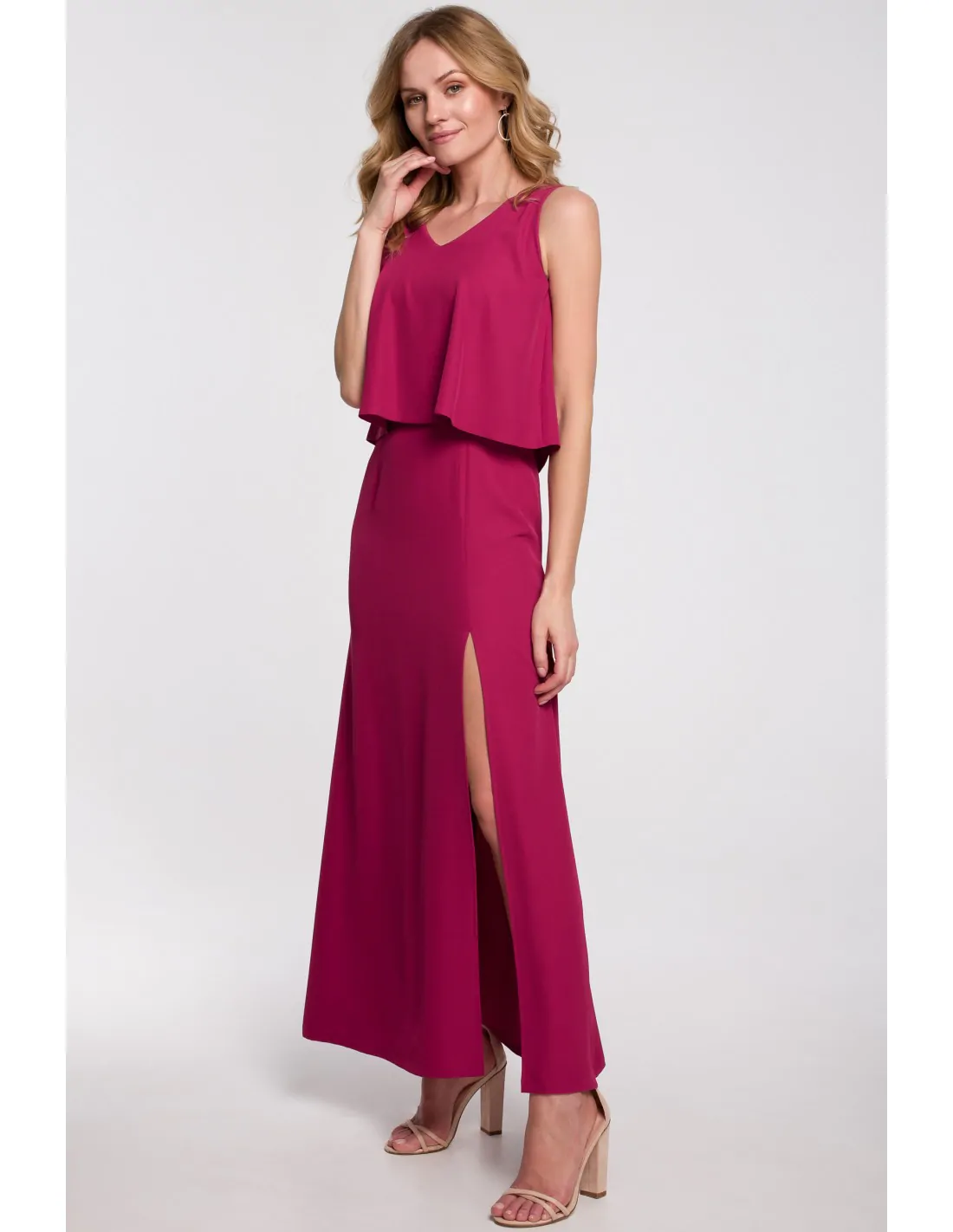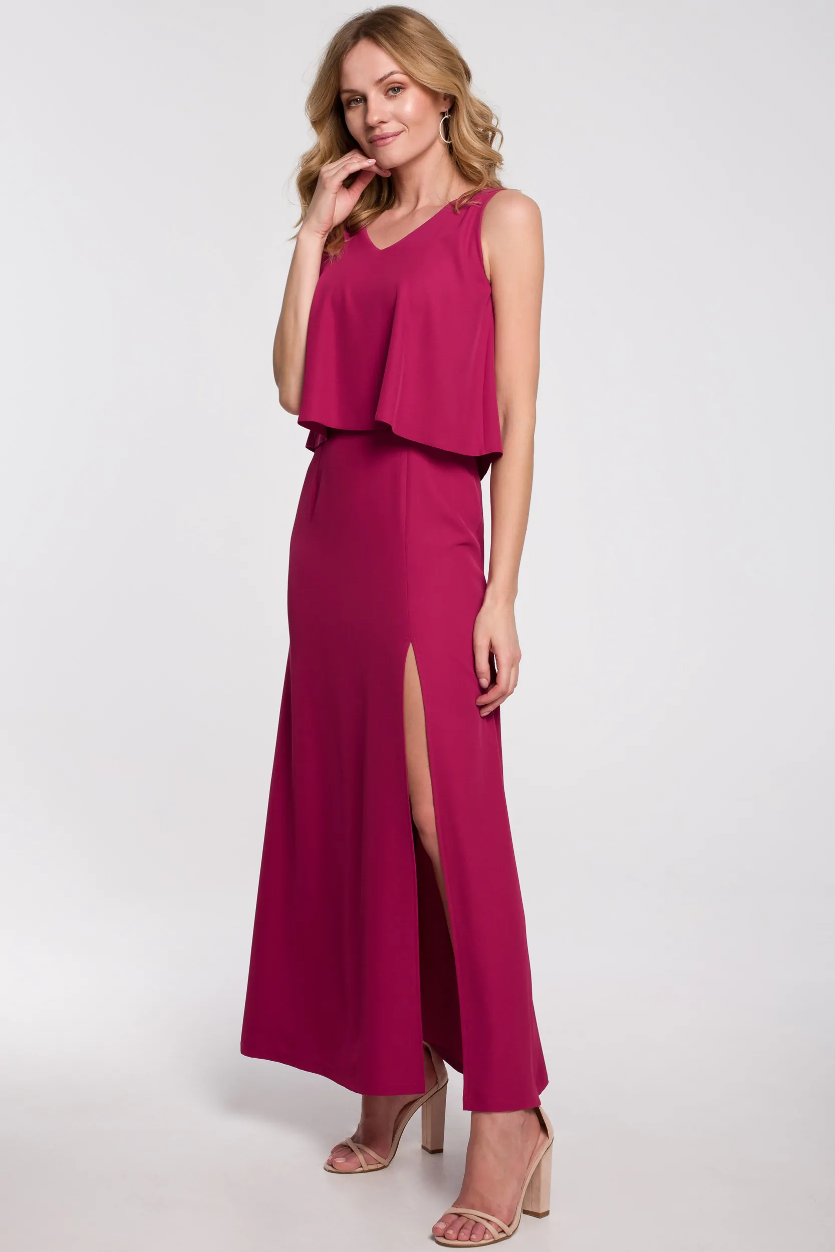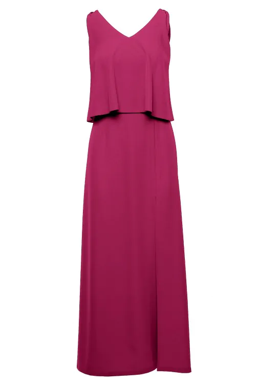 Sukienka maxi bez rękawów to jedna z ulubionych kreacji kobiet na cieplejsze dni bądź eleganckie wyjścia. Świetnie wygląda zarówno w codziennym, letnim wydaniu połączona z klapkami czy sandałkami, jak i wieczorowym z butami na obcasie. Sukienka z dwuwarstwową górą w oryginalnym śliwkowym odcieniu, na którą składa się podwójna warstwa materiału - wierzchnia warstwa tworzy falbanę z pęknięciem w tylnej części. Dekolt V optycznie wysmukla i wydłuża szyję oraz stanowi doskonałe tło dla biżuterii. Dół sukienki ma głębokie rozcięcie zmysłowo eksponujące nogę. Sukienka jest zapinana na suwak z tyłu. Wyprodukowaliśmy ją w Polsce.