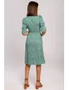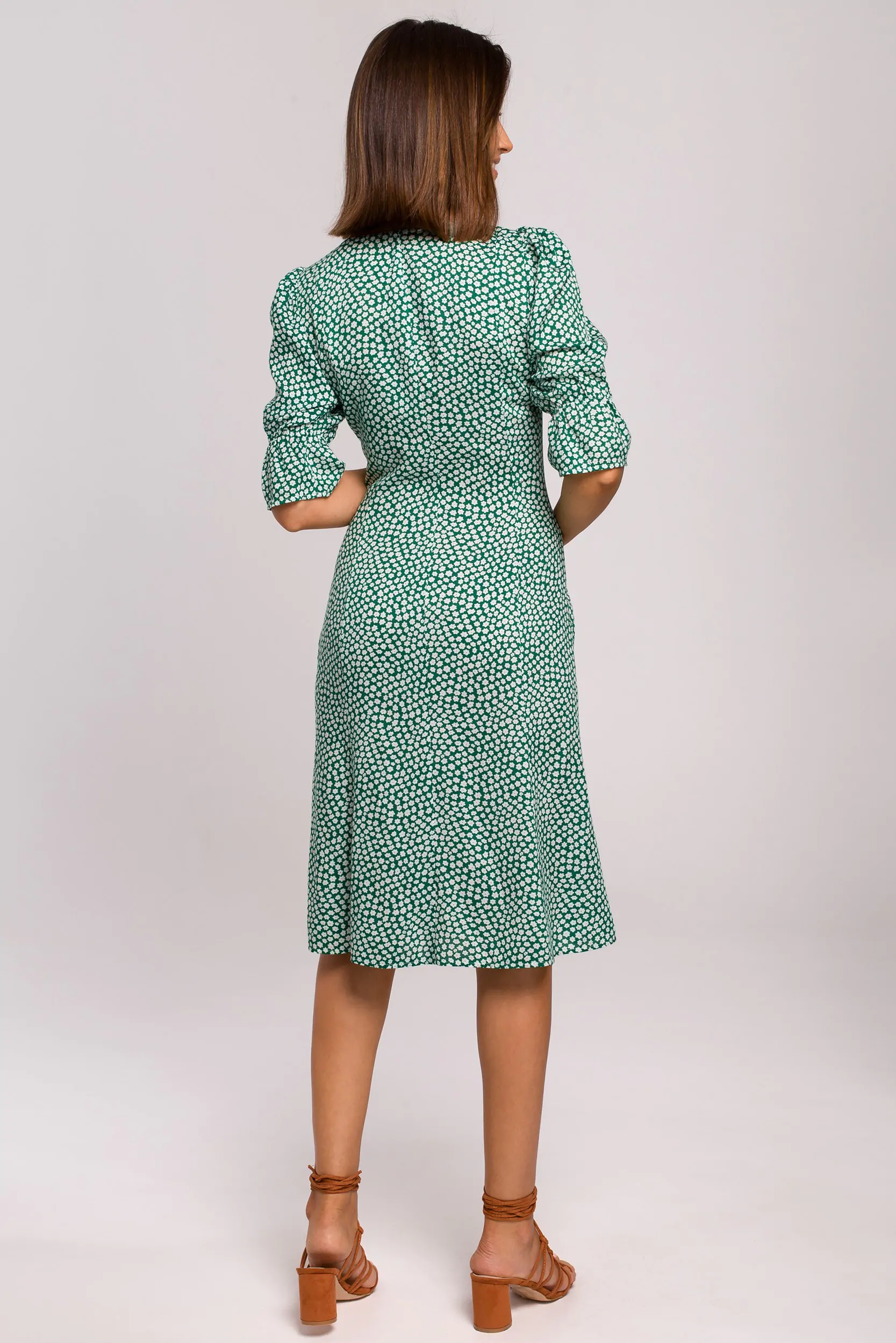 Niezwykle kobieca sukienka uszyta z miękko układającej się na sylwetce tkaniny z modnym printem. Dopasowana do sylwetki z lekko rozszerzanym dołem pięknie falującym podczas ruchu. Idealna na co dzień, na wakacje oraz różnego rodzaju wyjścia podczas wiosenno - letniego sezonu. Model z guzikami na przodzie, których nie da się rozpiąć - stanowią ozdobę przodu sukienki. Zastosowany rodzaj dekoltu karo w kształcie serduszka eksponuje biust i przykuwa uwagę. Bufiaste rękawy o długości ¾ zakończone falbanką dodają lekkości i nieco elegancji całości kreacji. Sukienka midi z guzikami nie wymaga wielu akcesoriów, aby stworzyć wyjątkowy outfit, dlatego też warto mieć ją w swojej garderobie! Wyprodukowana w Polsce.