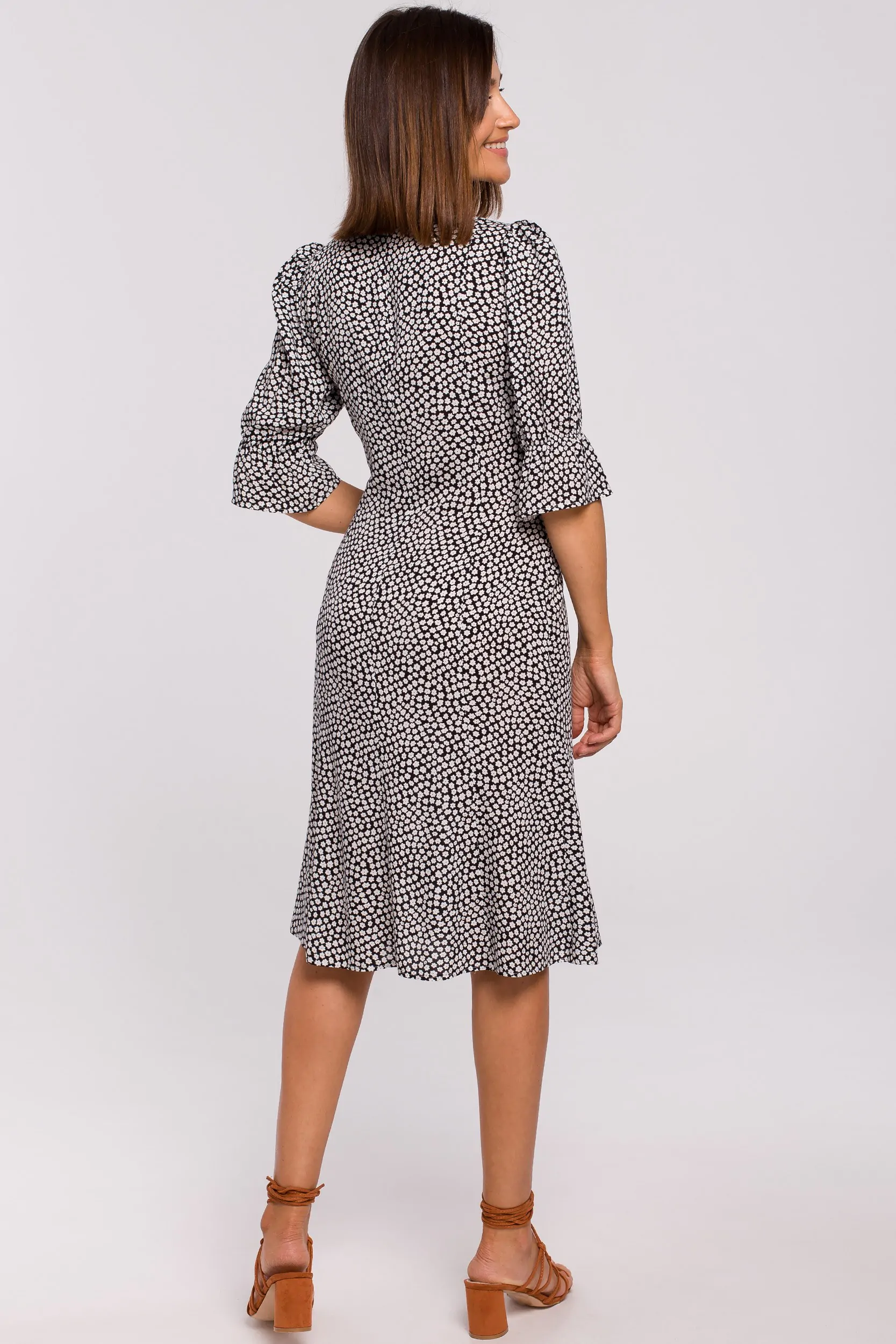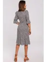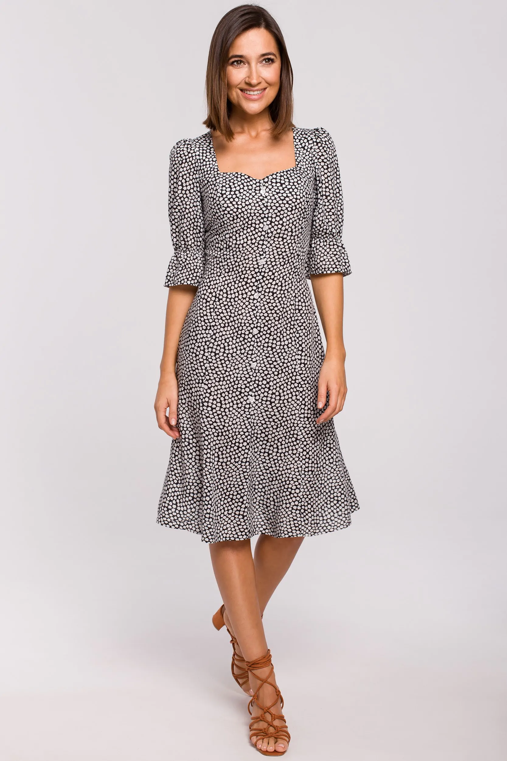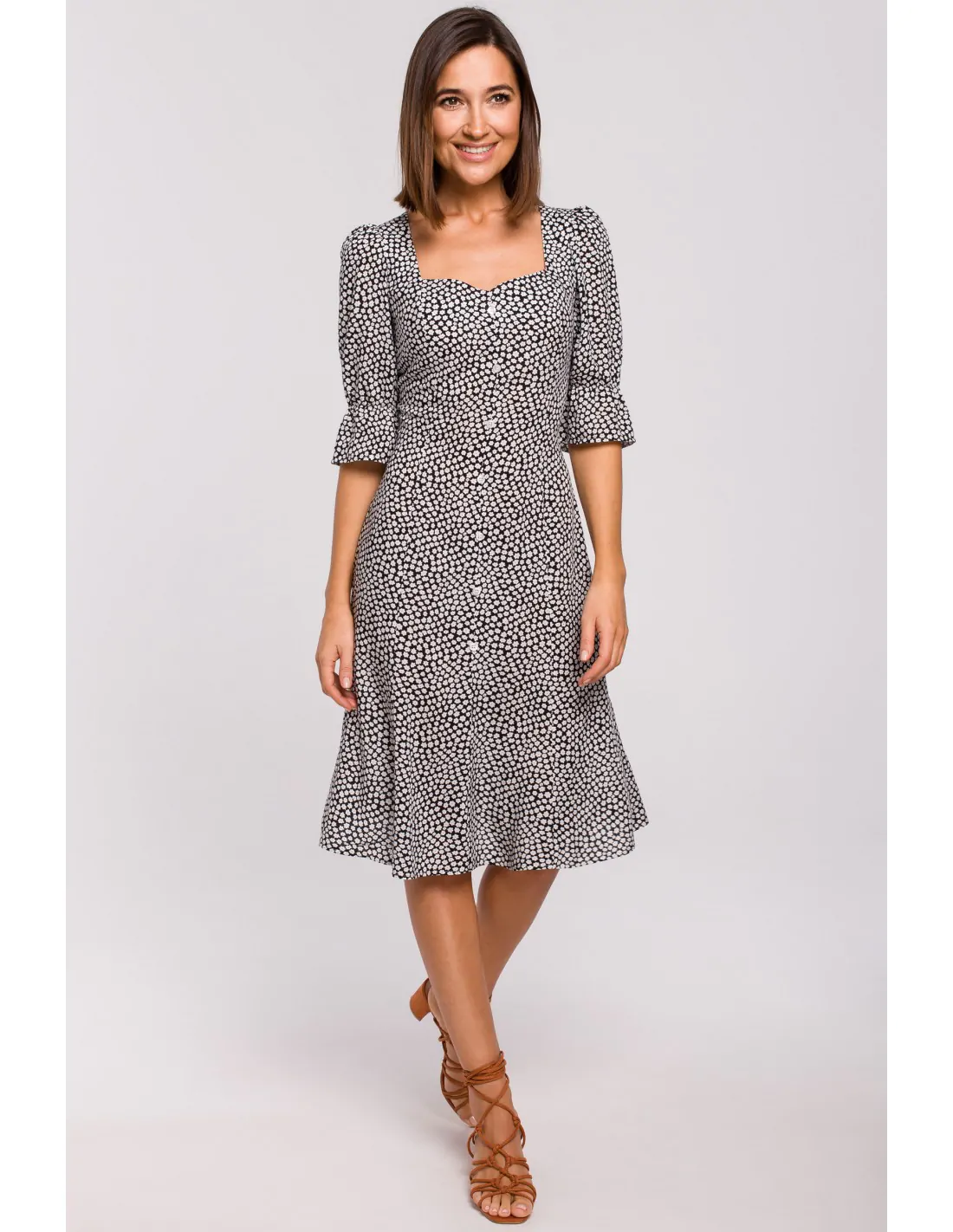 Niezwykle kobieca sukienka uszyta z miękko układającej się na sylwetce tkaniny z modnym printem. Dopasowana do sylwetki z lekko rozszerzanym dołem pięknie falującym podczas ruchu. Idealna na co dzień, na wakacje oraz różnego rodzaju wyjścia podczas wiosenno - letniego sezonu. Model z guzikami na przodzie, których nie da się rozpiąć - stanowią ozdobę przodu sukienki. Zastosowany rodzaj dekoltu karo w kształcie serduszka podkreśla biust i przykuwa uwagę. Bufiaste rękawy o długości ¾ zakończone falbanką dodają lekkości i nieco elegancji całości kreacji. Sukienka midi z guzikami nie wymaga wielu akcesoriów, aby stworzyć wyjątkowy outfit, dlatego też warto mieć ją w swojej szafie! Wyprodukowana w Polsce.