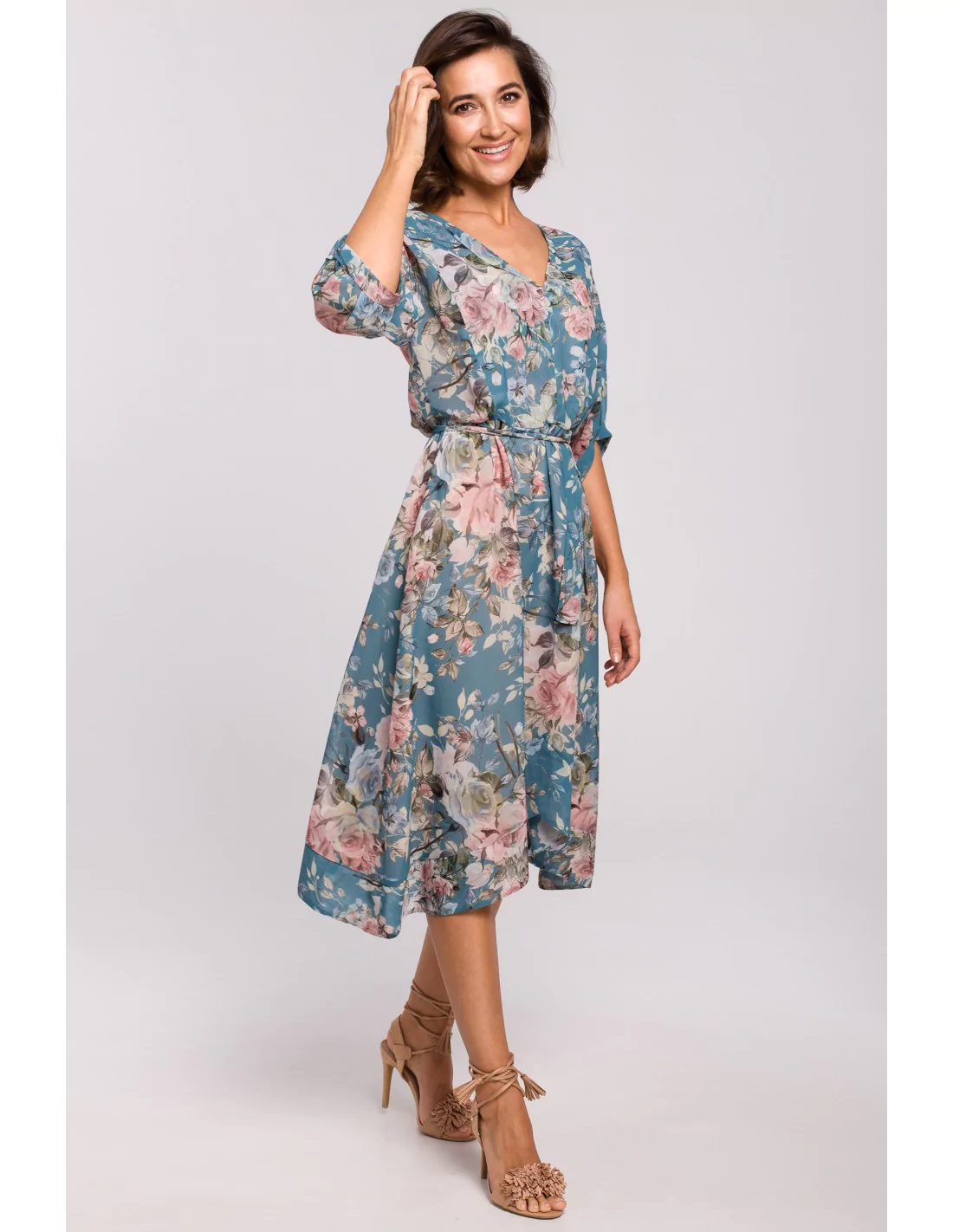 Wyjątkowo kobieca i zwiewna sukienka damska w kwiaty. Model wykonany z delikatnego szyfonu, który cechuje się niezwykłą lekkością, pięknie układa się na sylwetce oraz podczas ruchu. Sukienka urzeka swoim oryginalnym krojem. Jej dół wycięty jest asymetrycznie, a rękawy są przezroczyste, szerokie, tworzą bufkę i sięgają do łokcia. Linia ramion została delikatnie obniżona. Szyfonowa sukienka midi z asymetrycznym dołem ma również pasek, dzięki któremu podkreślisz swoją talię w najlepszy sposób. Dekolt V wysmukla i wydłuża szyję, daje też możliwość wyeksponowania ulubionego łańcuszka. Sukienką wyprodukowaliśmy w Polsce.