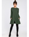 Na chłodniejsze dni sukienka z długimi rękawami i do tego wykonana z ciepłej dzianiny bawełnianej to strzał w dziesiątkę. Prosty trapezowy krój z dekoltem na zakładkę i ozdobnym paskiem z klamrą na boku podkreślają w subtelny sposób kobiecą sylwetkę. Wyprodukowano w Polsce.