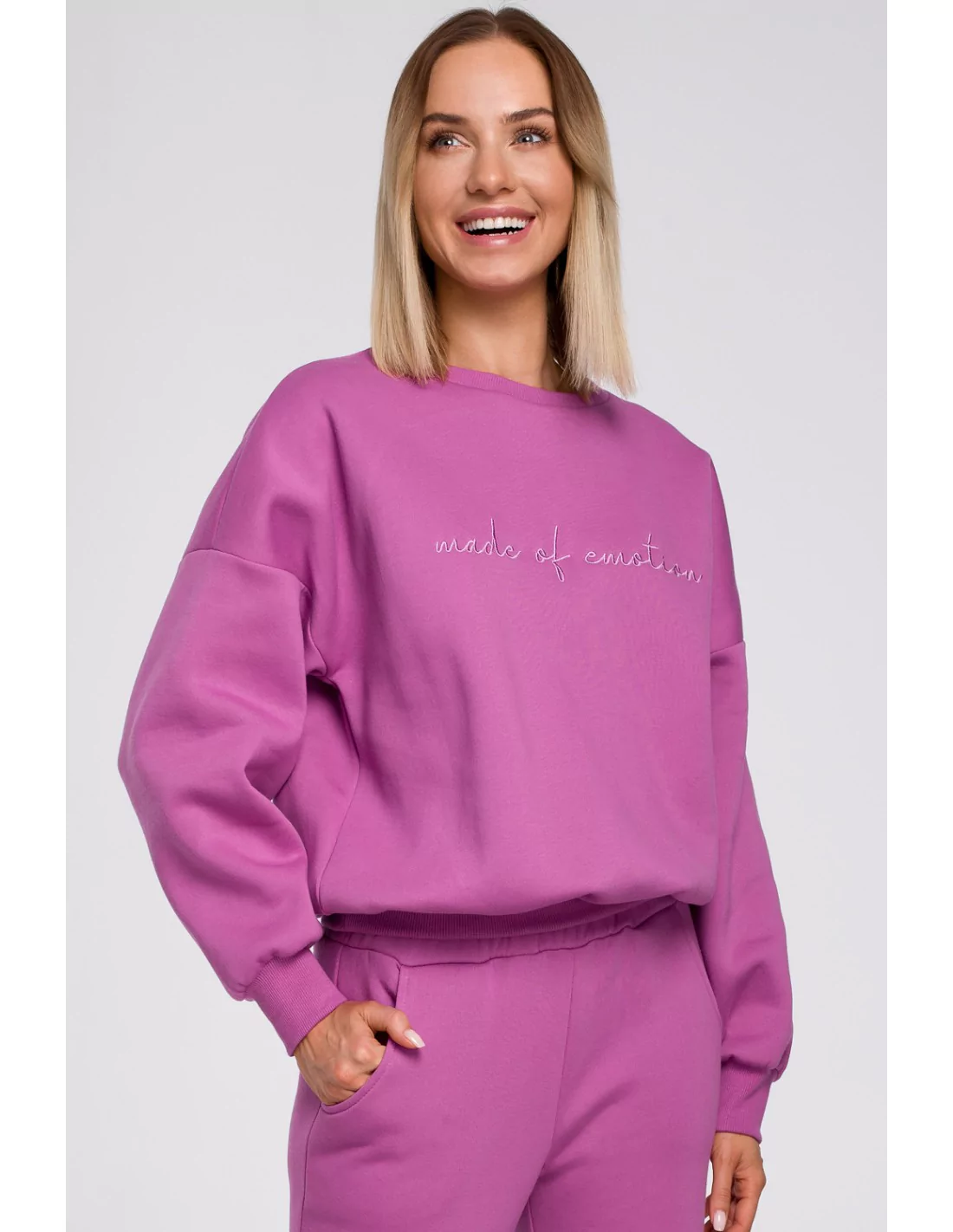 Bluzy oversize są uwielbiane przez kobiety i trudno się temu dziwić! Są nieziemsko wygodne, stylowe, ponadczasowe i świetnie sprawdzają się na wiele okazji. Dziś nosimy je wszędzie, nie tylko w domu czy na siłownię. Spacer z dzieckiem, spotkanie ze znajomymi, podróż wakacyjna czy trening na świeżym powietrzu - tam też Ci się przyda! Fioletową bluzę oversize z haftem możesz z powodzeniem łączyć ją z zarówno z innymi szerokimi rzeczami, jak i dopasowanymi - szortami typu biker, jeansami z wysokim stanem, spodniami dresowymi, spódniczkami mini. Możliwości jest naprawdę bardzo dużo, niech nie ogranicza Cię Twoja wyobraźnia! Swobodny krój, obniżona linia ramion oraz rękawy zakończone ściągaczami zapewniają komfort użytkowania i na pewno nie krępują ruchów. Haft “made of emotion” doskonale oddaje to, jak dbamy o każdy szczegół. Bluzę wyprodukowaliśmy w Polsce.