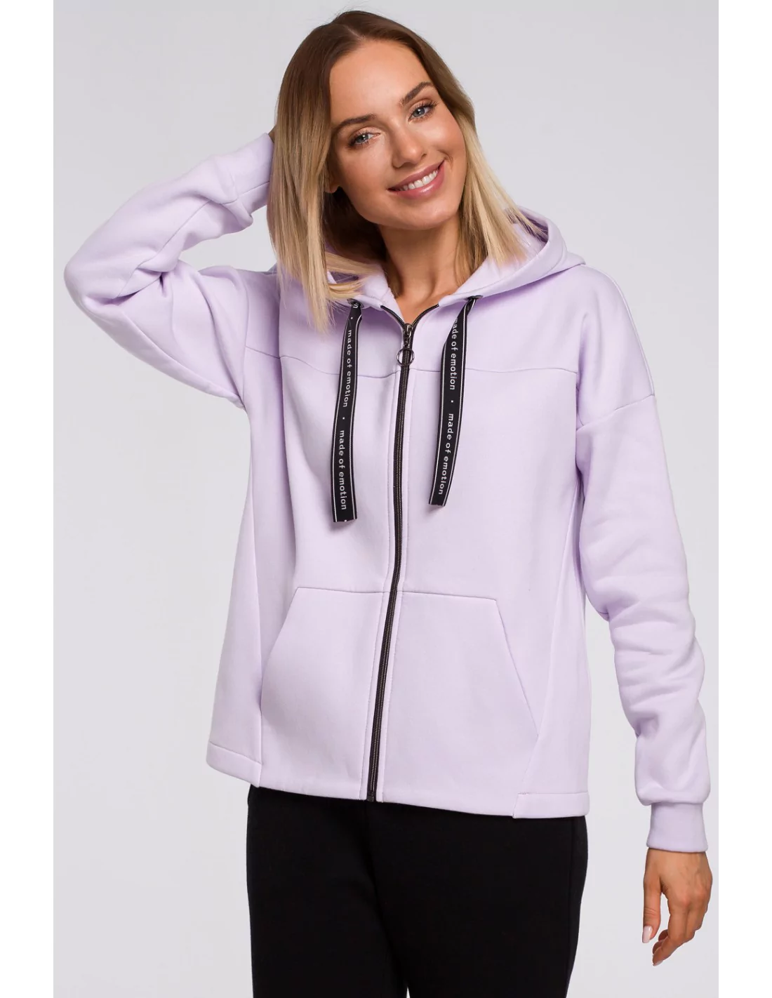 Liliowa rozpinana bluza z kapturem w sportowym stylu to jeden z obowiązkowych elementów garderoby każdej kobiety, która ponad wszystko uwielbia wygodne ubrania! Sportowy styl bluzy sprawi, że będzie ona idealnym towarzyszem podczas biegania, spaceru po parku czy jazdy na rowerze. Luźny krój, obniżona linia ramion, duża kieszeń na przodzie, przedłużony tył zakończony rozcięciem, geometryczne przeszycia, kontrastowe taśmy w kapturze - to elementy, które składają się na oryginalny charakter tego modelu. Dzięki zapinaniu na zamek jest wygodna i bardzo uniwersalna, możesz zarzucić ją na wszystko, zawsze świetnie wyglądać i równie dobrze się czuć. Duży kaptur zapewni Ci ochronę przed chłodem. Nadruk na tasiemce “made of emotion” mówi wszystko! Bluza została wyprodukowana w Polsce, z najwyższą dbałością o każdy szczegół i z miłości do wygody.
