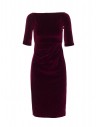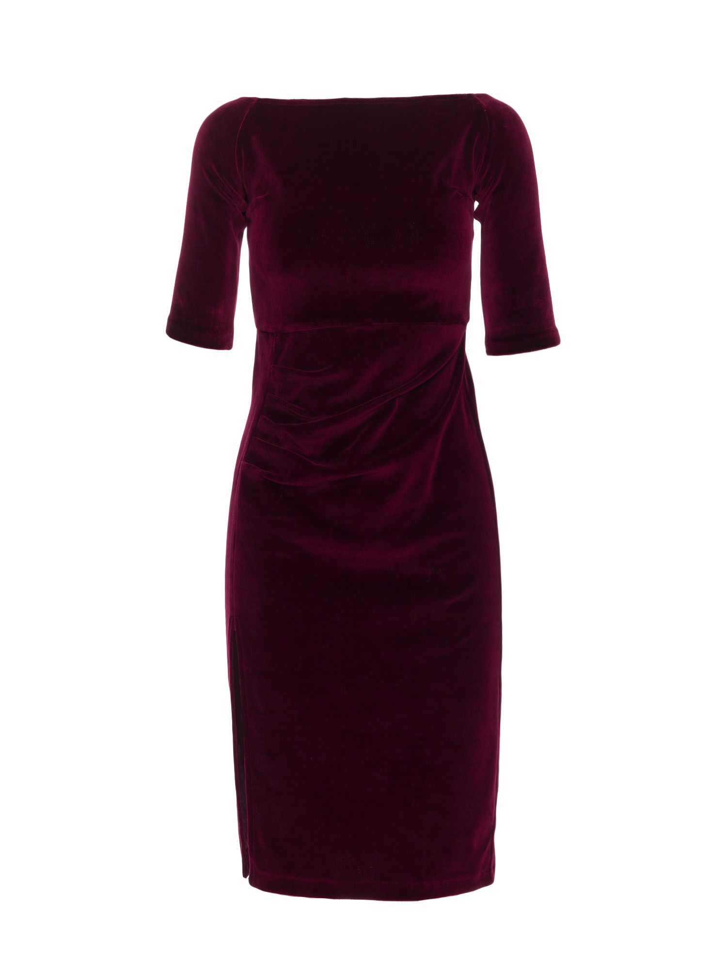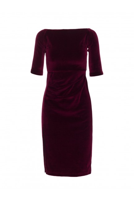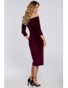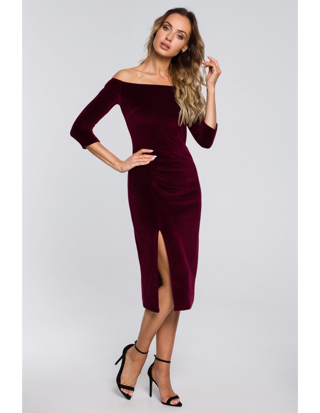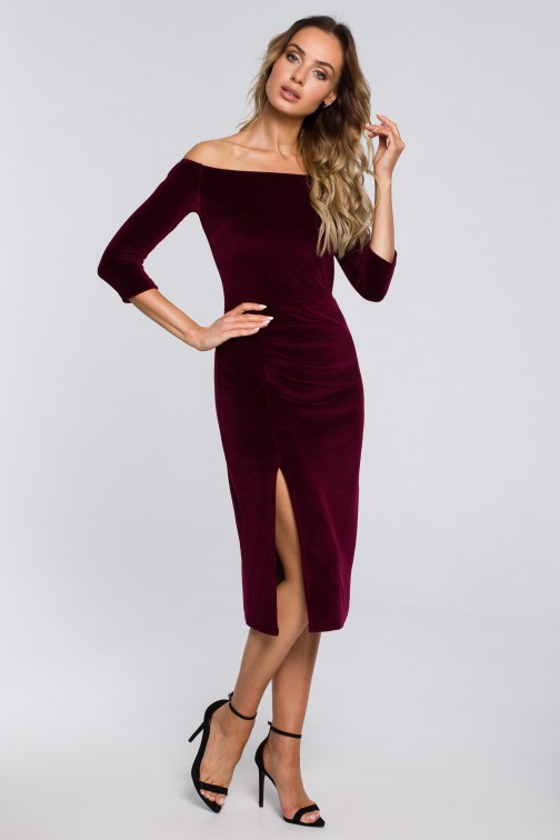 Ta sukienka ma w sobie tyle elegancji, szyku i zmysłowości ile da się zamknąć w jednej formie! Dopasowany krój, który pięknie podkreśla talię, rozporek z przodu czarujący zmysłowością i jeszcze dekolt w łódkę opadający na ramiona, który podkreśla linię obojczyków. Buty i torebka w tym przypadku powinny być bardziej skromne, żeby nie przyćmić tej kreacji. Eleganckie szpilki i prosta kopertówka będą strzałem w dziesiątkę! Nie trzeba jej dodatkowo ozdabiać, bo połyskujący materiał jest sam w sobie oryginalną dekoracją. Jeśli jednak uwielbiasz biżuterię to eleganckie kolczyki czy delikatna bransoletka będą pasować wyśmienicie. Bordowa welurowa dopasowana sukienka z rozporkiem została wyprodukowana w Polsce.