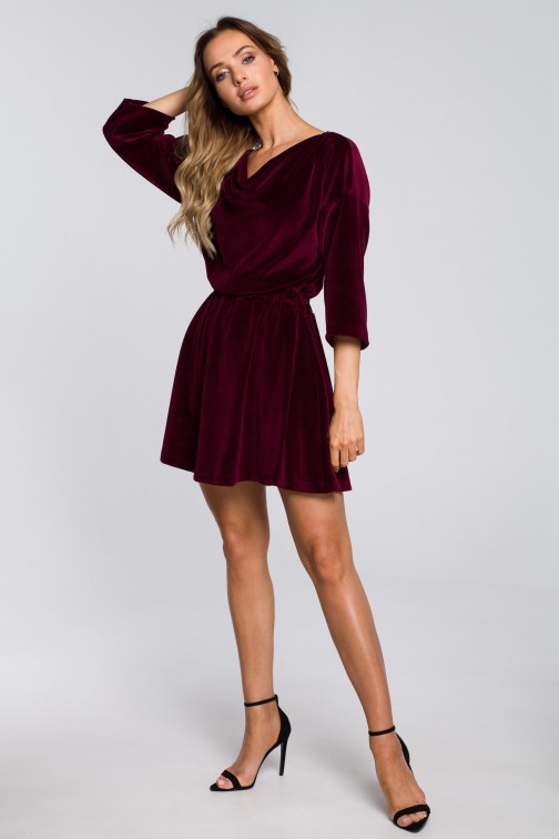 CM5672 Rozkloszowana sukienka welurowa z gumą w pasie - bordowa