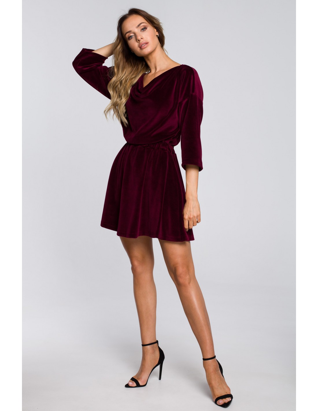 Fashionistki pokochały welurowe sukienki! Podążając za modą nie może jej zabraknąć w Twojej garderobie! Polecamy Ci jedną z nich - bordową rozkloszowaną mini sukienkę z weluru. Dekolt typu woda pięknie uwydatnia linię obojczyków oraz optycznie powiększa biust, a szeroka guma w talii modeluje sylwetkę i sprawi, że sukienka będzie zawsze nienagannie wyglądać. Rękawy o długości ¾ pozwolą Ci wyeksponować wyjątkową biżuterię, na przykład zegarek czy delikatną lub szeroką bransoletkę. Gładkie, ponadczasowe kolory dają dużo możliwości jeśli chodzi o dobór dodatków. Sukienka będzie doskonałym składnikiem zarówno dziennych, jak i wieczorowych stylizacji. Jak stworzyć idealny outfit? W miejskim wydaniu zestaw ją z ciężkimi botkami i skórzaną ramoneską oraz stylowym kapeluszem. To jest totalnie hot wersja! Na randkę, przyjęcie, uroczystość rodzinną lub wszędzie tam, gdzie potrzebujesz bardziej eleganckiego dress codu, załóż szpilki i małą torebkę na łańcuszku. Sukienka wyprodukowana w Polsce.
