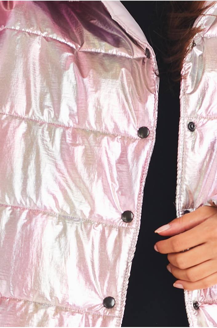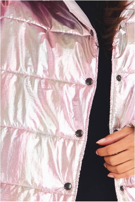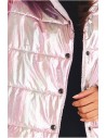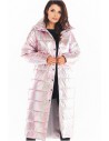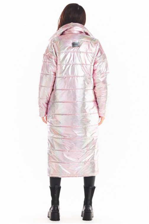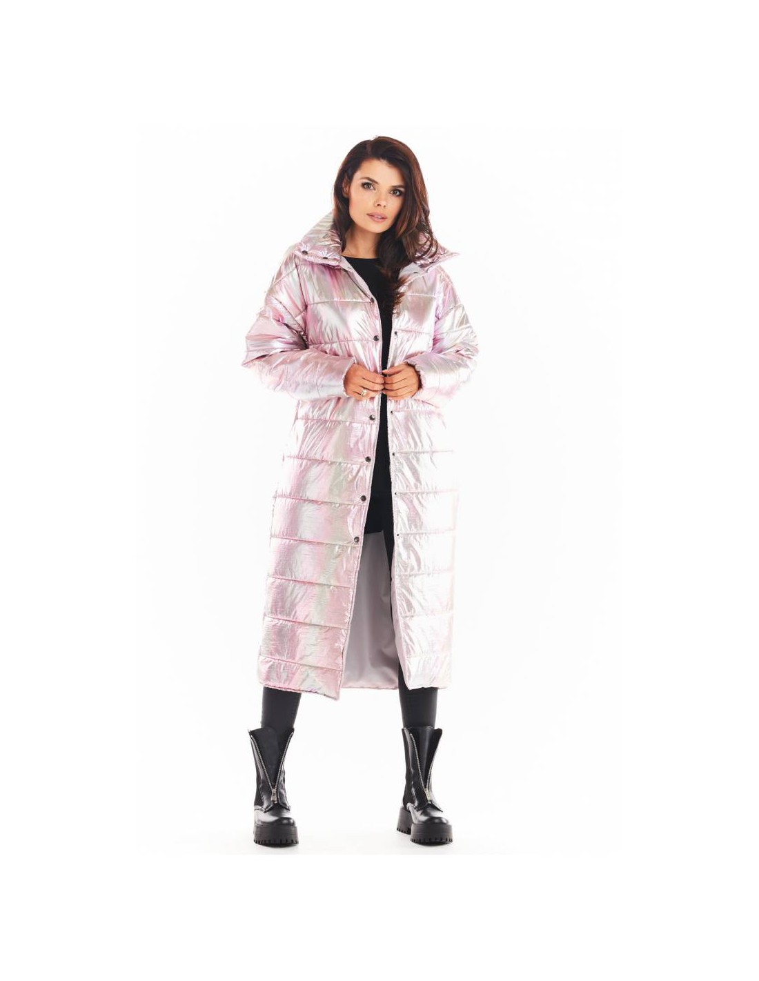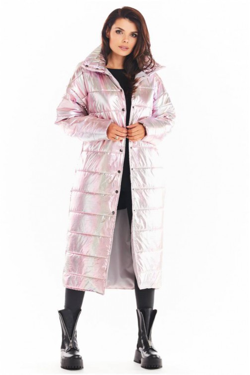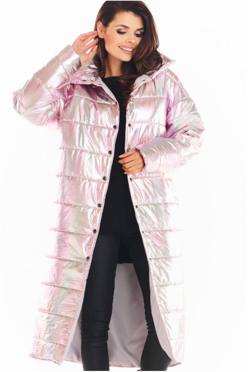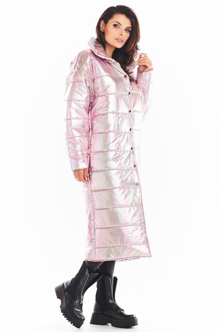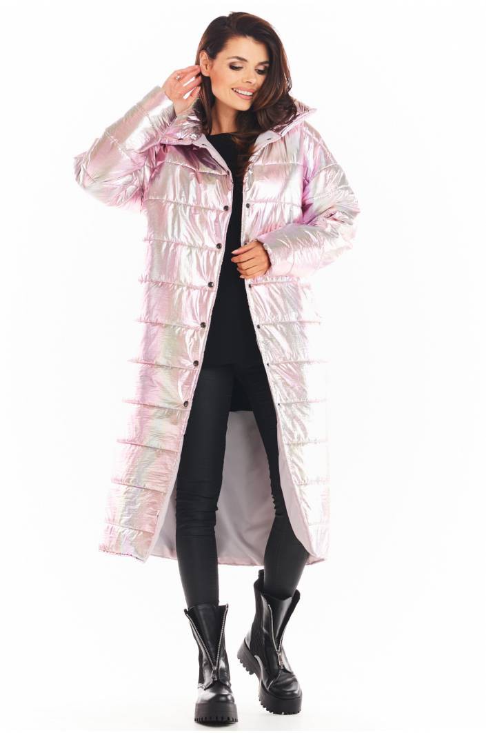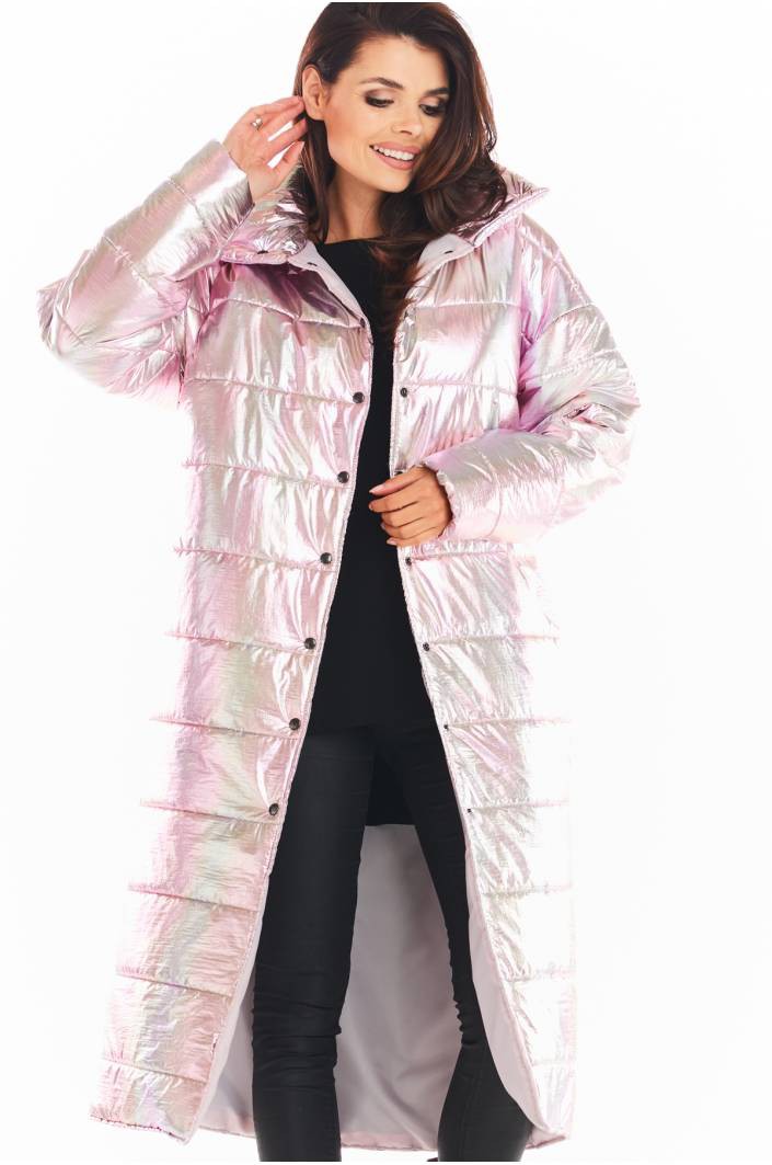 Długi, prosty płaszcz holograficzny zapinany na napy. Wysoki kołnierz ochroni przed chłodem. Ręce możemy ukryć w kieszeniach, które są w szwach bocznych na wysokości bioder. Wyprodukowano w Polsce.