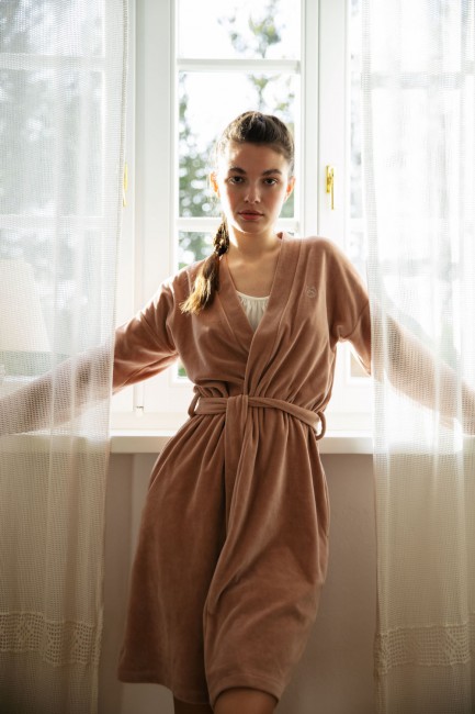Welurowy, długi szlafrok z paskiem ozdobiony haftem na piersi. Stylowy i elegancki a także przyjemny dla skóry bo wykonany z dzianiny składającej się w 80% z bawełny. Wyprodukowano w Polsce.