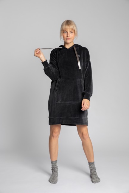 Sukienka kangurka z kapturem i atłasowymi trokami oraz ozdobnym haftem - na sportowo, do legginsów ale i do spodni na co dzień - praktyczna i wygodna bo wykonana z dzianiny bawełnianej. Wyprodukowano w Polsce.