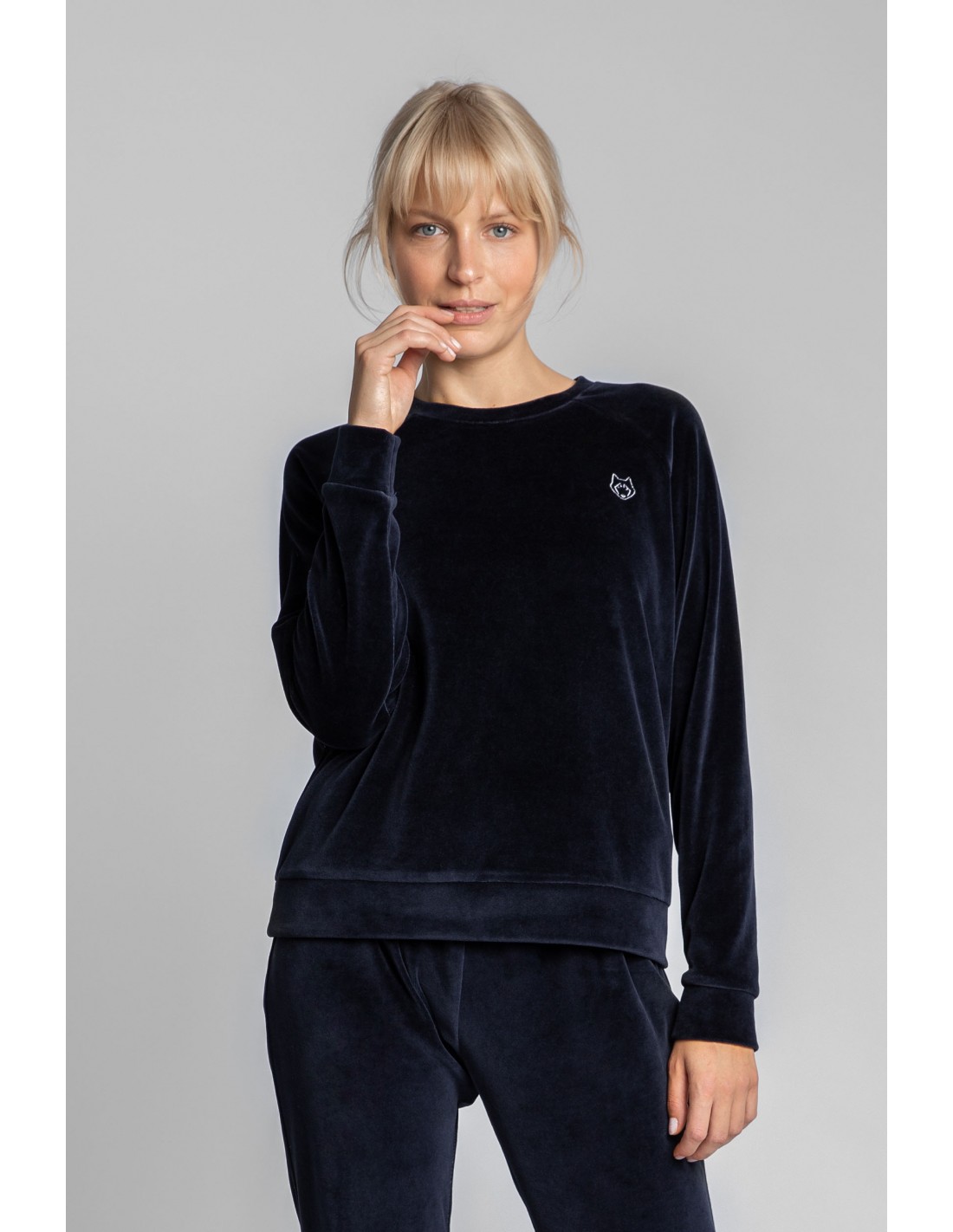Wyjątkowa, bo welurowa - bluza z raglanowymi rękawami zakończonymi mankietami i z ozdobnym wilczym haftem na piersi. Wyprodukowano w Polsce.