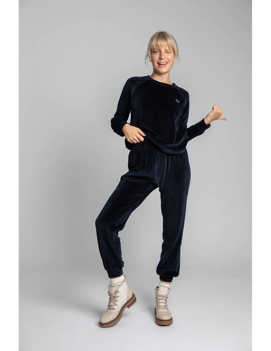 Niezwyczajne joggery w wersji welurowej. Ta lekko połyskująca dzianina bawełniana jest przyjemna w dotyku i prezentuje się pięknie! W pasie guma. Wyprodukowano w Polsce.