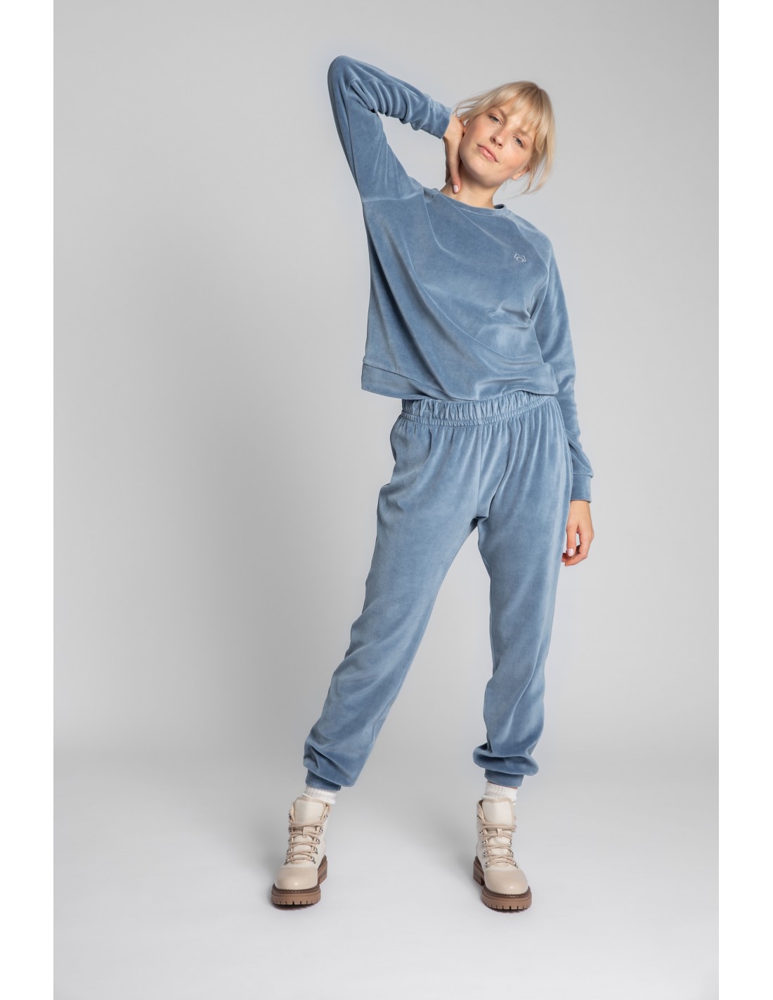 Niezwyczajne joggery w wersji welurowej. Ta lekko połyskująca dzianina bawełniana jest przyjemna w dotyku i prezentuje się pięknie! W pasie guma. Wyprodukowano w Polsce.
