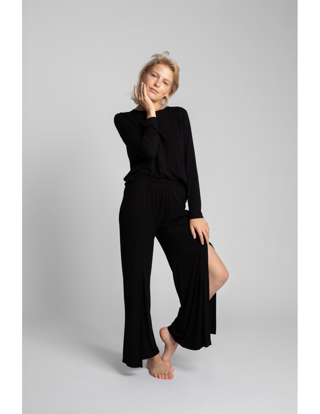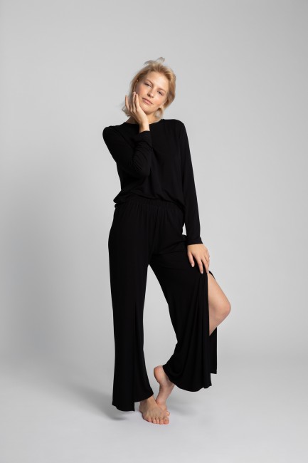 Ach, cóż to za spodnie! Uszyte z lekkiej, „lejącej” wiskozy, z wysokimi rozcięciami pośrodku nogawek na przodzie. Proszą się - wyskocz z łóżka i ruszaj do tańca, do jogi, do aktywności! Wyprodukowano w Polsce.